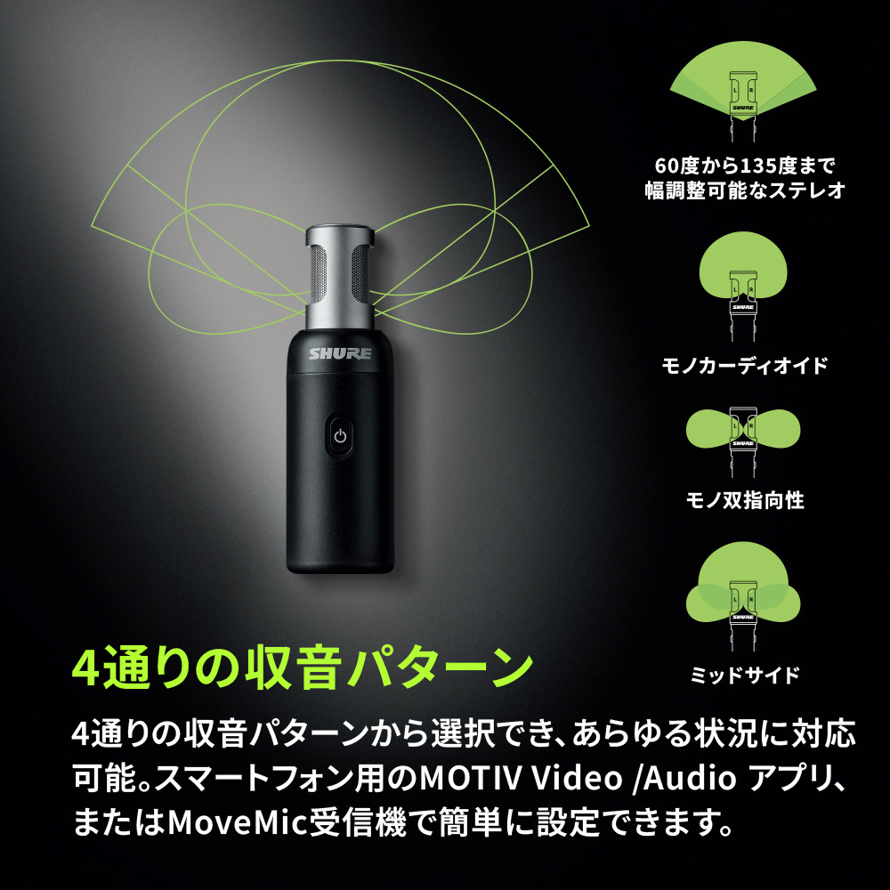 定評のあるShure MV88+ および MV88モデルのテクノロジーを組み合わせたポケットサイズの MoveMic 88+は、4つの収音パターン(60度から135度まで幅調整可能なステレオ、モノカーディオイド、モノ双指向性、ミッドサイド)から1つを選ぶことで、収音方法をすばやく設定できます。