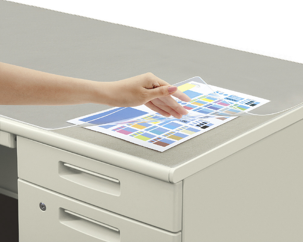 環境に配慮したオレフィン系樹脂使用のデスクマット。挟んだ書類が見やすい透明タイプ。グレーの下敷き付き。