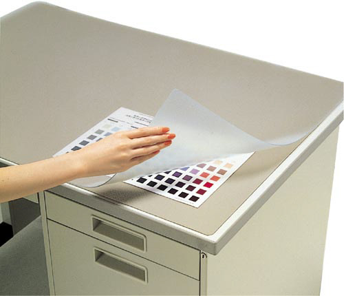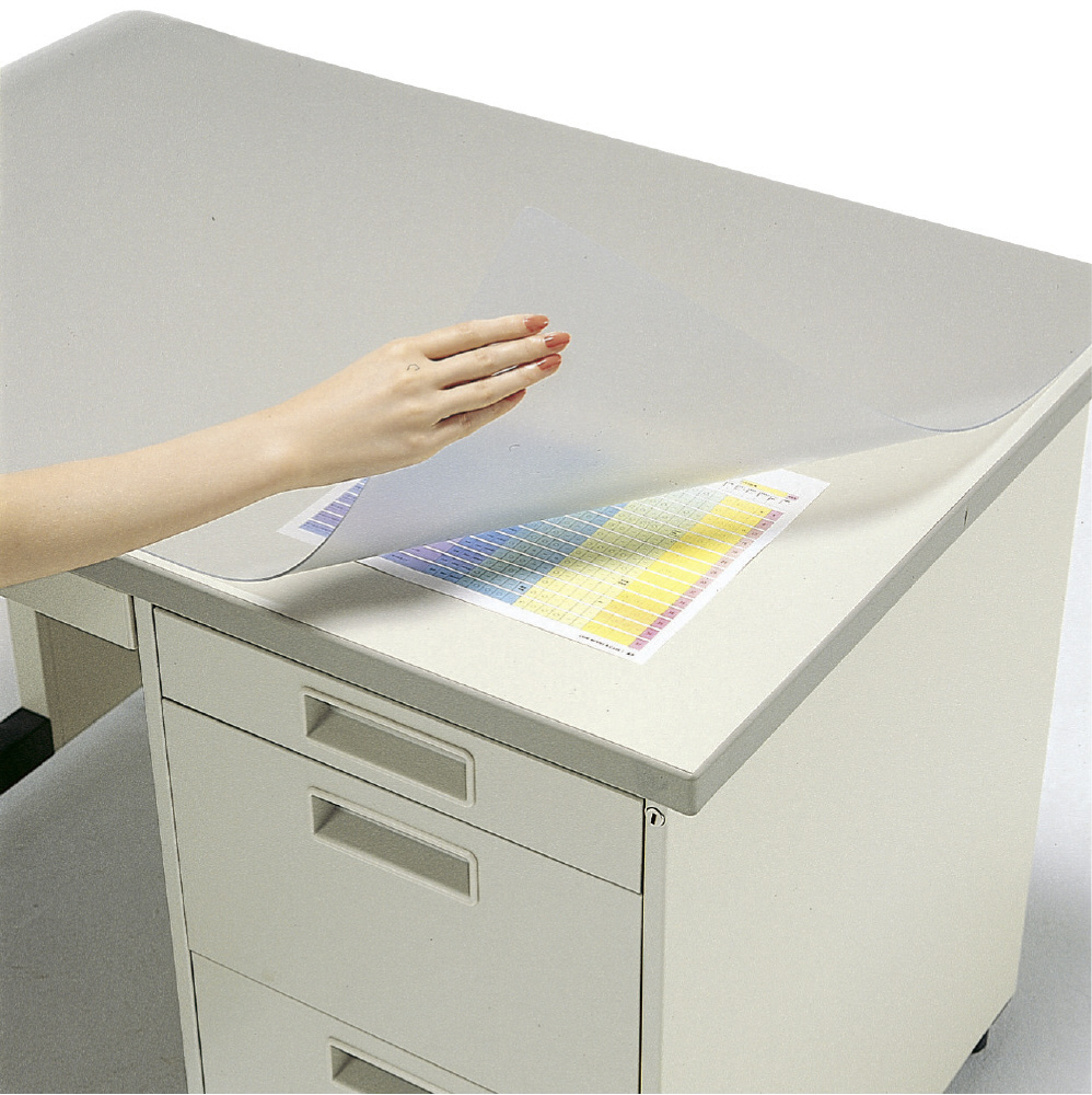環境に配慮した再生オレフィン系樹脂使用のデスクマット。光の反射が少なく、目にやさしいタイプ。