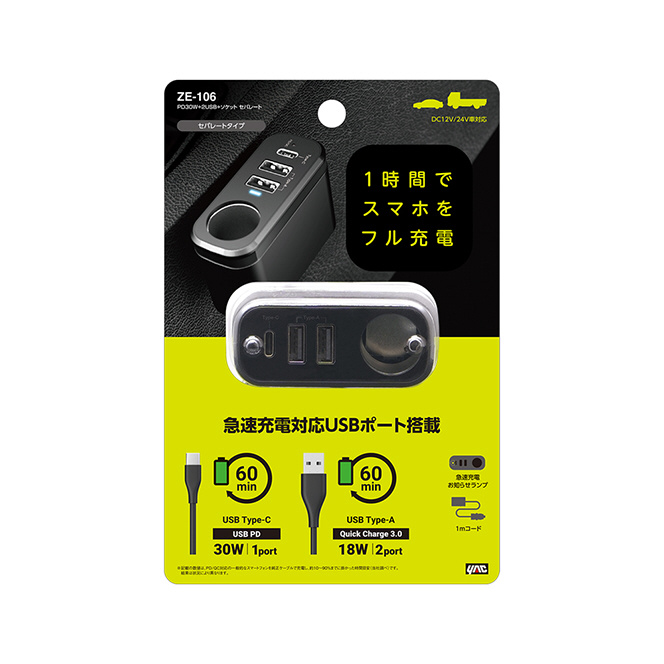 急速充電対応USBポートコードタイプソケット+QC18W TYPE-A×2/PD30W TYPE-C