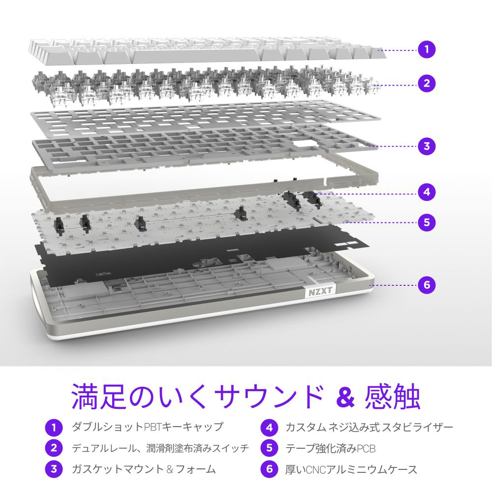 PCBとプレートの間にラバーガスケットを採用し、クッション性のある打鍵感と心心地よい聴覚フィードバックを実現しています。