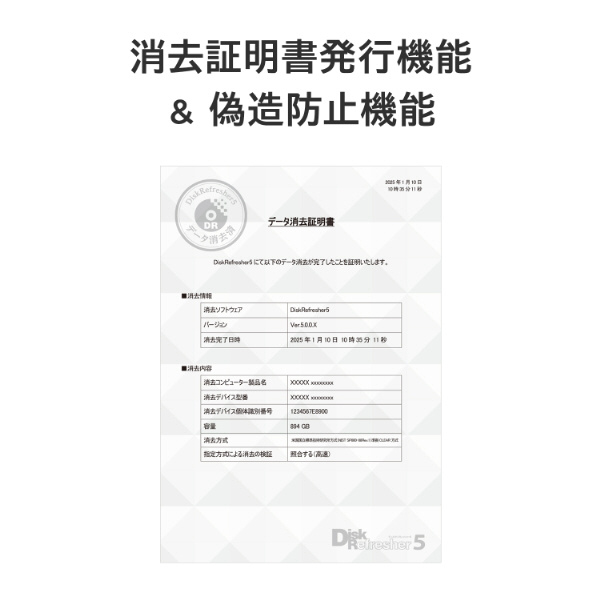 ソフトウェア「DiskRefresher5」を使用すれば、強固なデータ消去を行うことができます。また、消去証明書の発行も可能です。