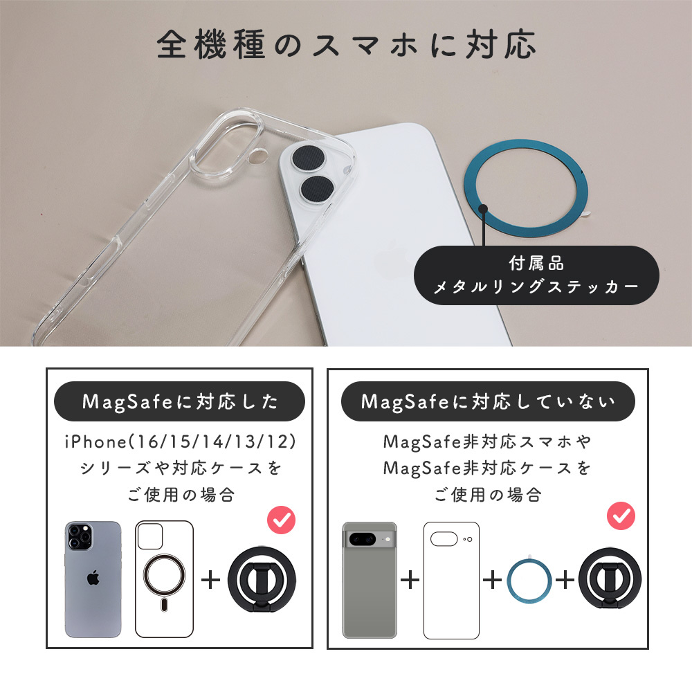Magsafeに対応したiPhone(iPhone16/15/14/13/12シリーズ)やケースには直接貼り付けて使用可能です。付属のメタルリングを使用すれば、Magsafe非対応のスマートフォンやケースでも、装着することができます。
