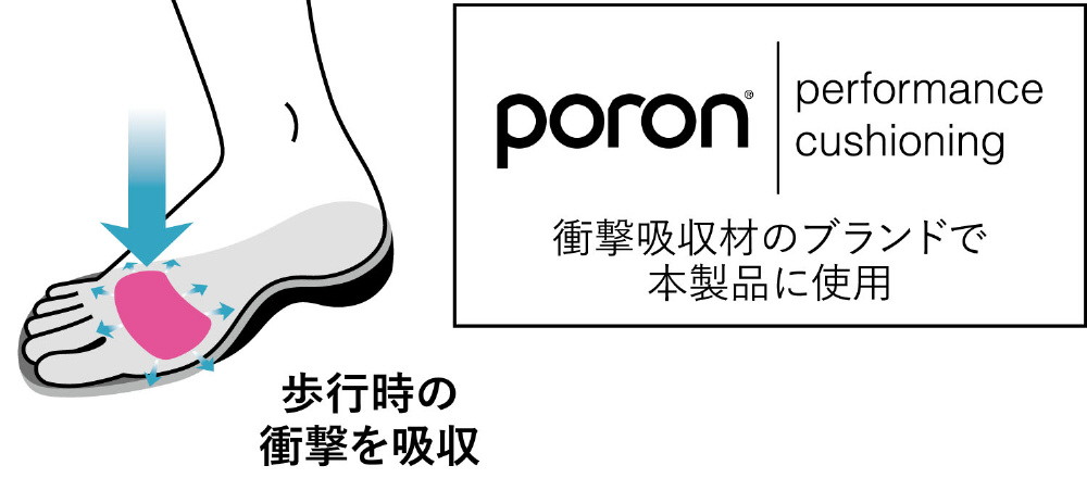 AKAISHIインソールは、この部位に高性能衝撃吸収材「PORON(R)」を採用し負担を軽減します。