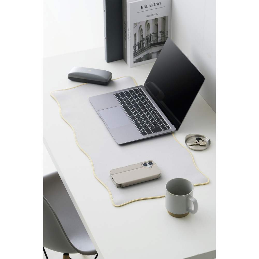 デスクに彩りと快適さをプラス。波のようなウェーブラインが個性的なデスクマットです。2色のコントラストが美しいバイカラーデザインで、デスクを華やかに彩ります。広々としたサイズでノートパソコンやキーボードをまとめて置け、マウス操作も快適。デスクを傷から守りつつ、きれいに保てます。