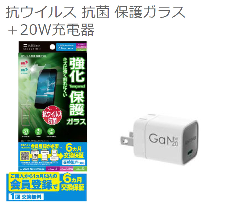 【SBセレクション】iPhone 16e/14/13Pro/13 抗菌ガラス&充電セット クリア ZSQJZA