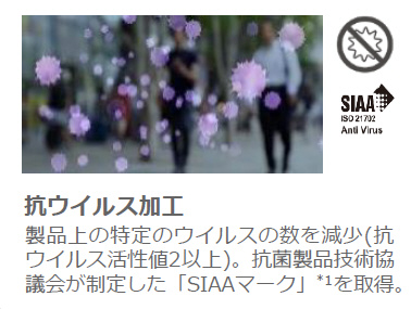 製品上の特定のウイルスの数を減少(抗ウイルス活性値2以上)。抗菌製品技術協議会が制定した「SIAAマーク」を取得。