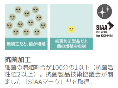 細菌の増殖割合が100分の1以下(抗菌活性値2以上)。抗菌製品技術協議会が制定した「SIAAマーク」を取得。