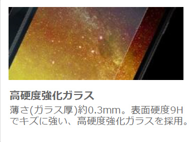 薄さ(ガラス厚)約0.3mm。表面硬度9Hでキズに強い、高硬度強化ガラスを採用。