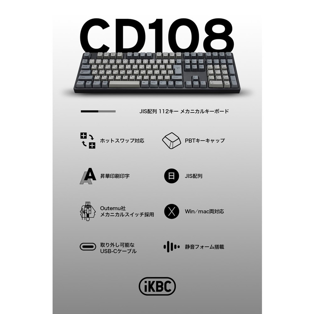 CD108はGATERON社とOutemu社のメカニカルスイッチを搭載したメカニカルキーボードです。PCでの作業を効率化させる様々な工夫を凝らした設計になっており、サイズは100%レイアウトのフルサイズキーボードで日本語キー配列。キースイッチはGATERON社(G Proシリーズ)とOutemu社を採用し、赤軸(リニア)・茶軸(タクタイル)・青軸(クリッキー)・クリームイエロープロ サイレント軸(タクタイル)から好みの打鍵感の物を選択できます。ホットスワップにも対応しており、別売の互換スイッチを購入することで変更が可能です。