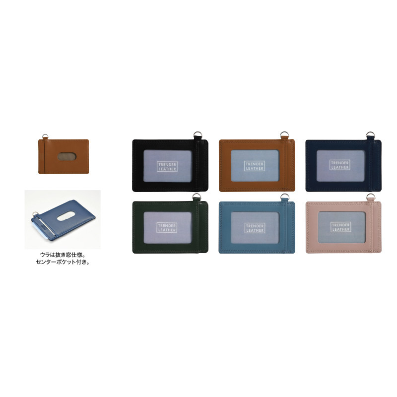 ●材質:牛革(スムース仕上げ)、内生地:シャンタン(レーヨン100%)●仕様:シングル型、パス窓2面(セル抜き窓あり/台形窓あき)、センターポケット、Dカン付き(金属)●サイズ 105×72mm