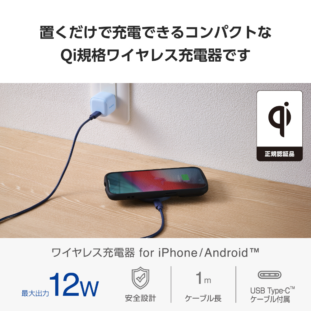 対応するAndroidやiPhoneを置くだけで充電できる、Qi規格ワイヤレス充電器です。手のひらサイズで持ち運びに便利。天面に滑り止めパッドを配置しており、スマートフォン本体への傷やバイブレーションによる滑り落ちを抑制します。USB Power Delivery対応のAC充電器を接続することで最大12Wの高速充電が利用できます。