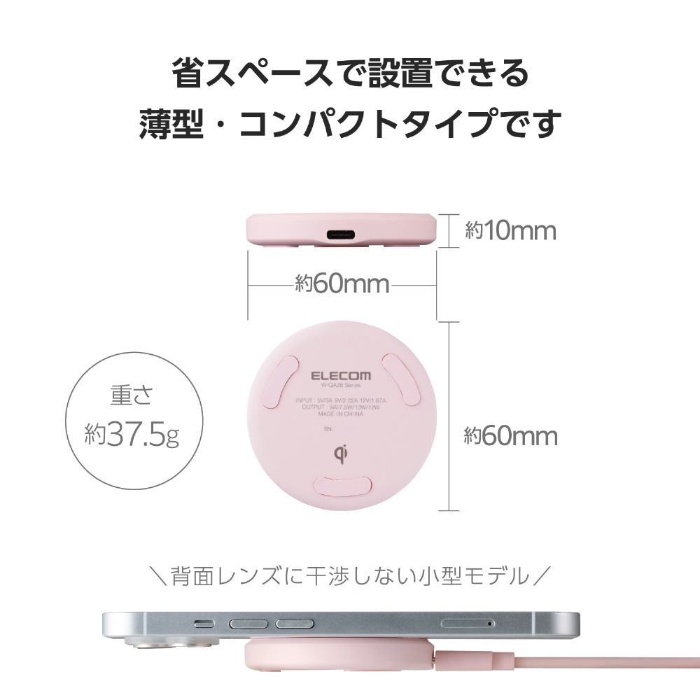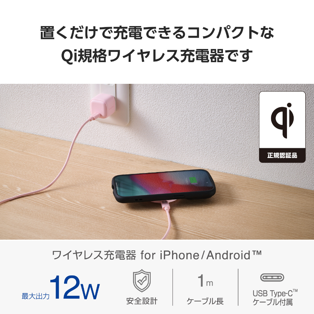 ワイヤレス充電器 Qi 認証 12W / 10W / 7.5W / 5W 卓上 充電器 ケーブル付属 1m 置くだけ充電 薄型 コンパクト 【 iPhone AirPods Android Pixel Xperia Galaxy 等対応 】 ピンク W-QA28PN