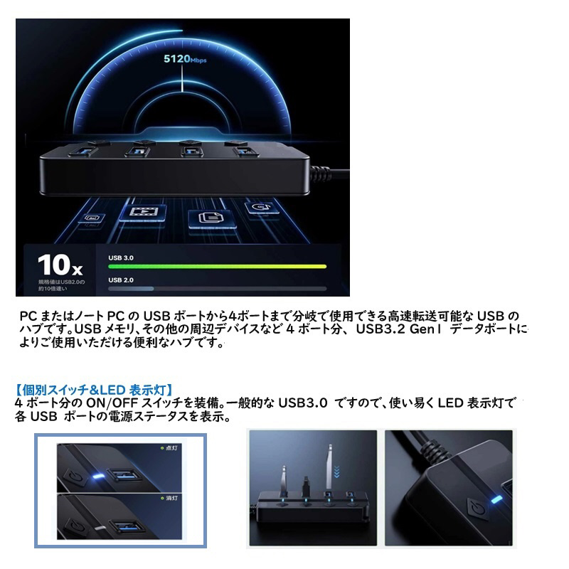高速転送5Gbps USB ハブ USB3.0 4ポート