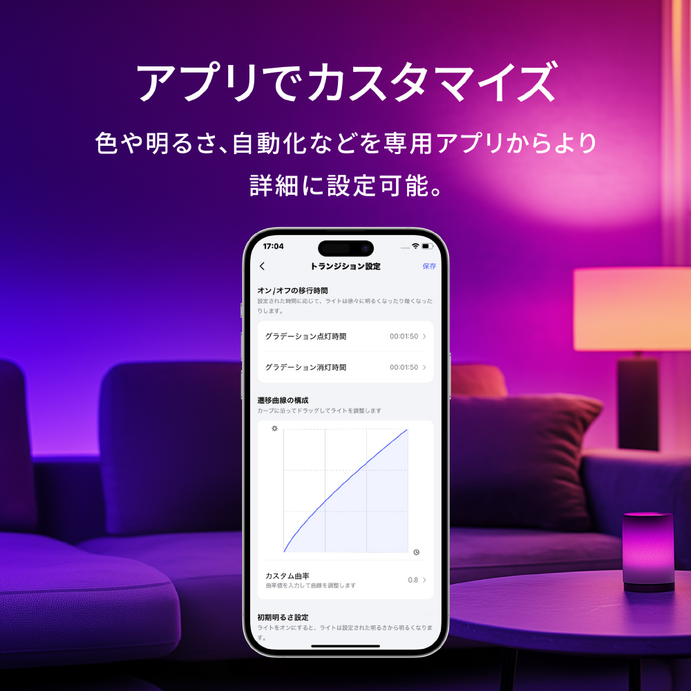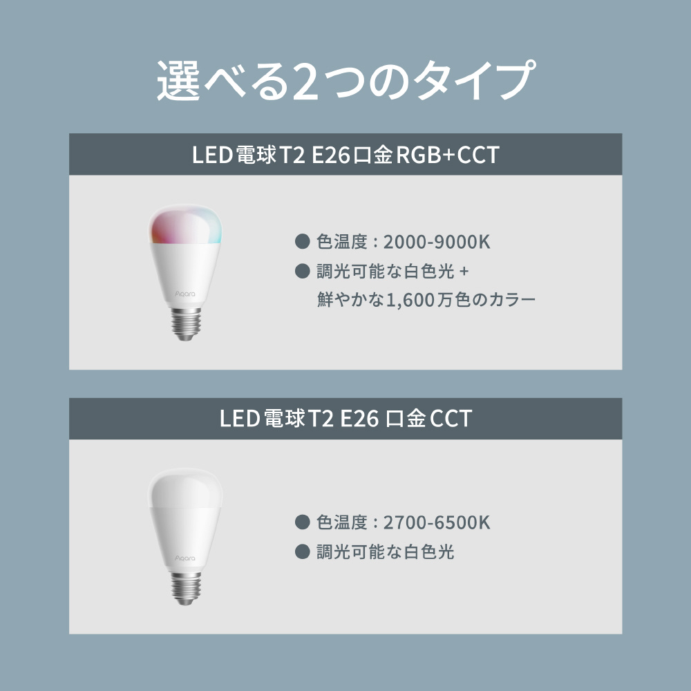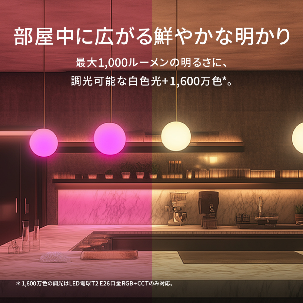 最大1,100ルーメンの非常に明るいED電球 T2は、調光可能な白色光+1,600万色のカラフルな発色が可能なRGB+CCTモデルと、電球本来の発色光のみを鮮やかに調光できるCCTモデルの2種類から選べます。