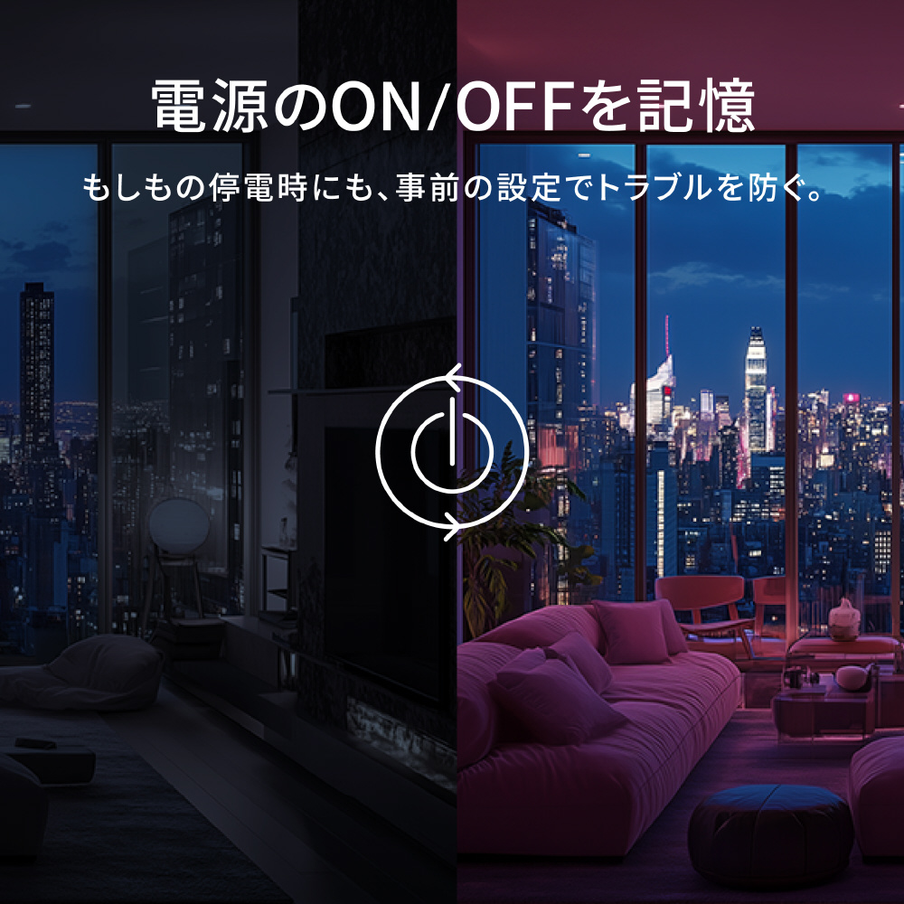 事前にライトがONまたはOFFになるかを設定することで、もしもの停電時や、真夜中に突然ライトが点灯するなどのトラブルを防ぎます。
