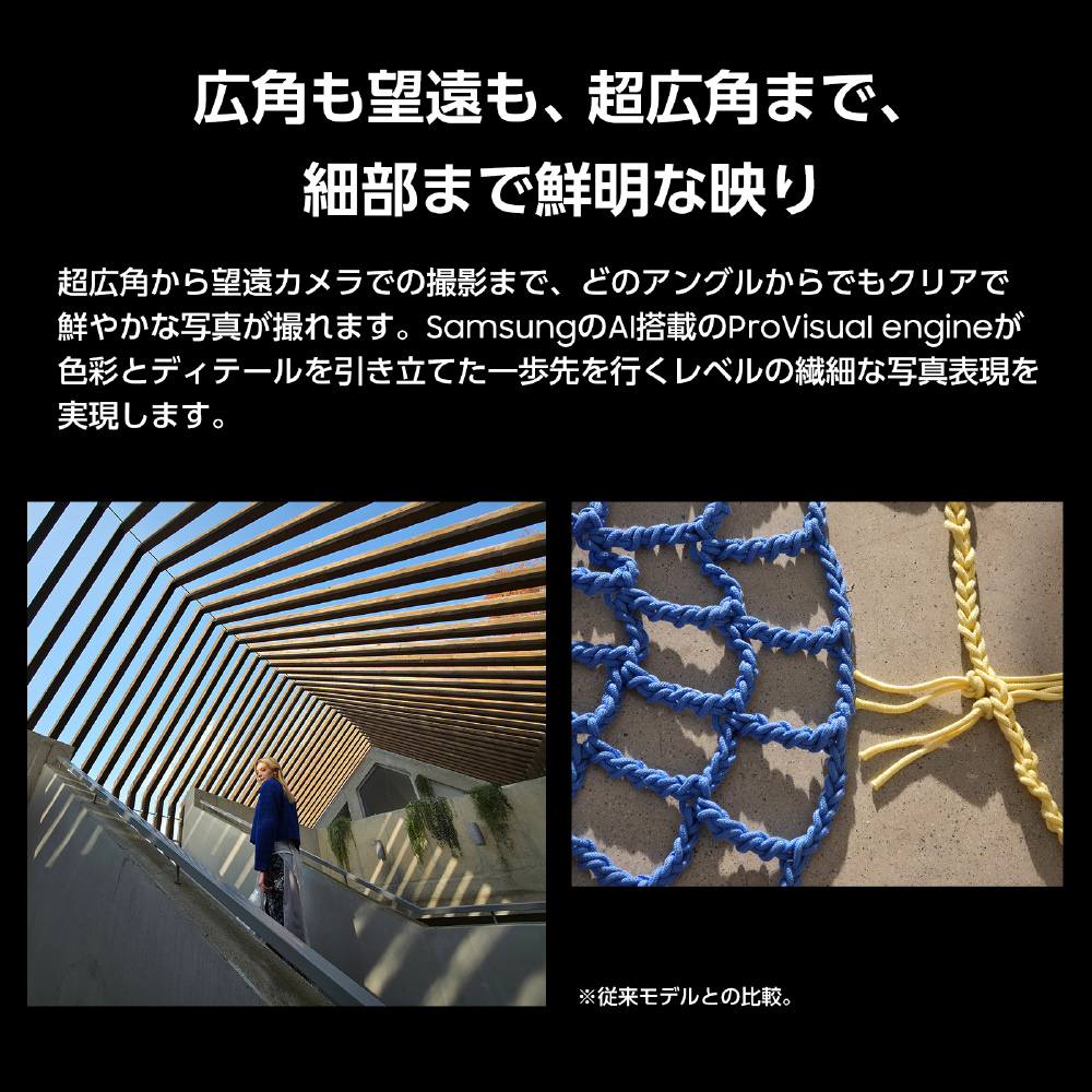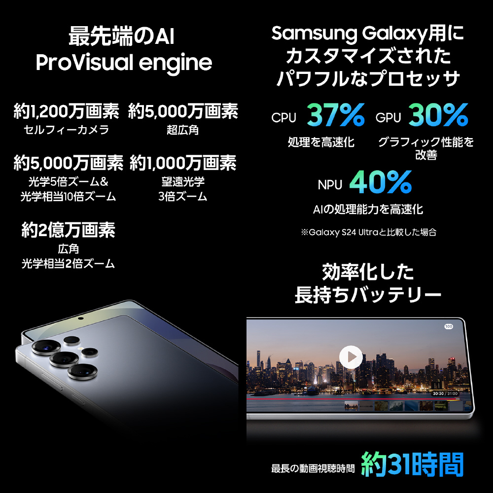 従来よりさらに大きくクリアになった約6.9インチの明るい大画面で圧倒的な没入感と操作性を実現。 さらにGalaxy史上最速・最強のチップセット「Snapdragon(R) 8 Elite for Galaxy」を搭載。従来よりも拡大した超強力な冷却システム「ベイパーチャンバー」との組み合わせで、内部の熱を効率的に発散。持続するパフォーマンスならカクつくことなく長時間ゲームをプレイしても快適。
