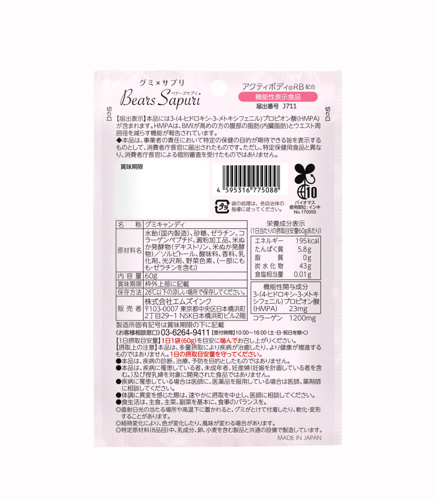 BMIが高めの方の腹部の脂肪(内臓脂肪)とウエスト周囲径を減らす効果が報告されている「3-(4-ヒドロキシ-3-メトキシフェニル)プロピオン酸(HMPA)」を配合したグミサプリメントです。