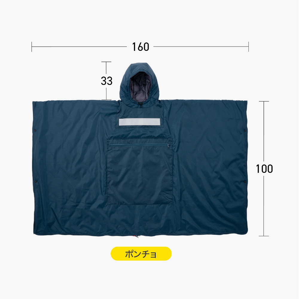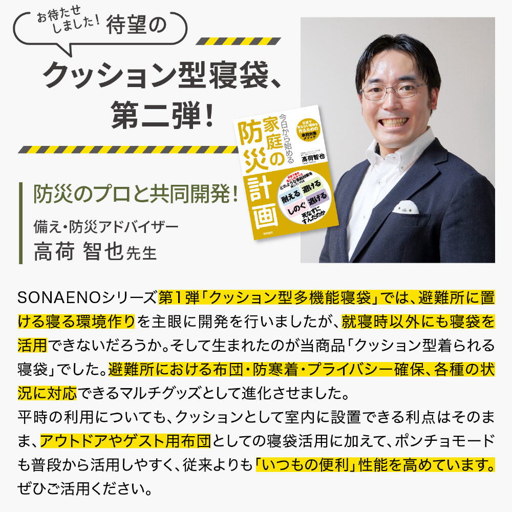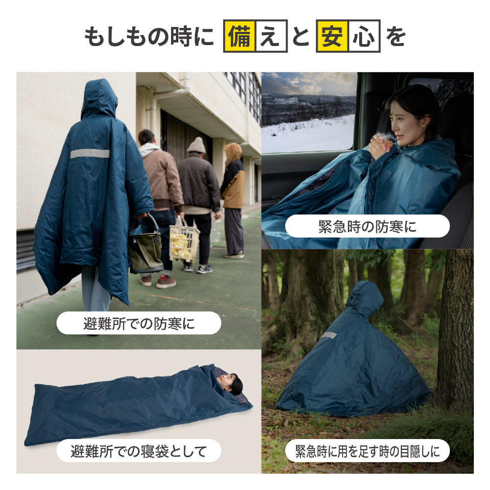 日常使いはクッションで保管に困らなく、災害時には防寒対策/目隠しになる着られる寝袋。雨風に強い耐水機能でポンチョにもなる。夜でも安心の反射テープほか、家でも外でも便利機能が満載。袋が必要無い一体型収納で、折りたたむだけでクッションに。