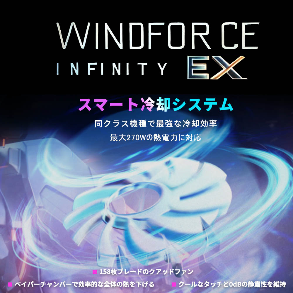 AORUS MASTER 18は最大270Wの総合熱設計電力(TDP)を誇り、先進的なWINDFORCE Infinity EX冷却技術により、そのパワーを最大限に引き出します。AORUS MASTER 18は、ベイパーチャンバーと4基のファンで超強力冷却。新世代性能を余すことなく発揮しつつ、安定した冷却性能を維持し、低負荷時には0dBの静音環境を提供します。