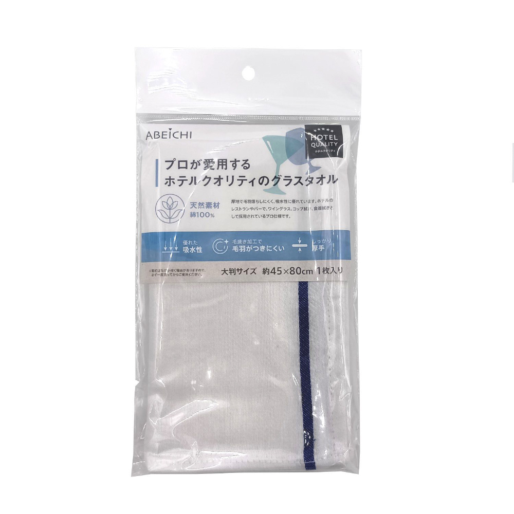 プロが愛用するホテルクオリティのふきん。ワイングラスやコップ拭きに最適な綿100%のグラスふきんです。グラスだけでなく、食器拭きにもご利用いただけます。綿100%なので肌触りがよく、吸水性に優れています。グラスに毛羽が残りにくいふきんです。※最初は毛羽が付く場合がありますので、一度洗ってからご使用ください。