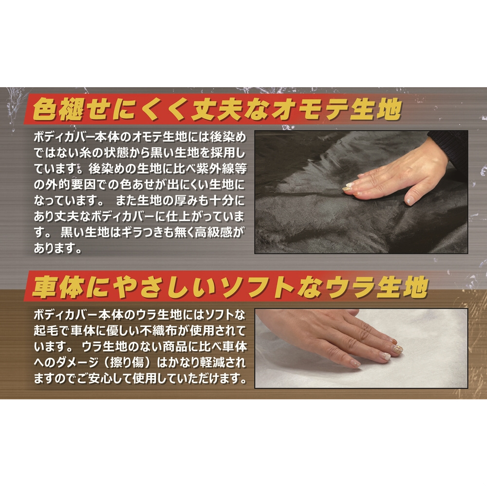 ボディカバー本体のオモテ生地には後染めではない糸の状態から黒い生地を採用しています。