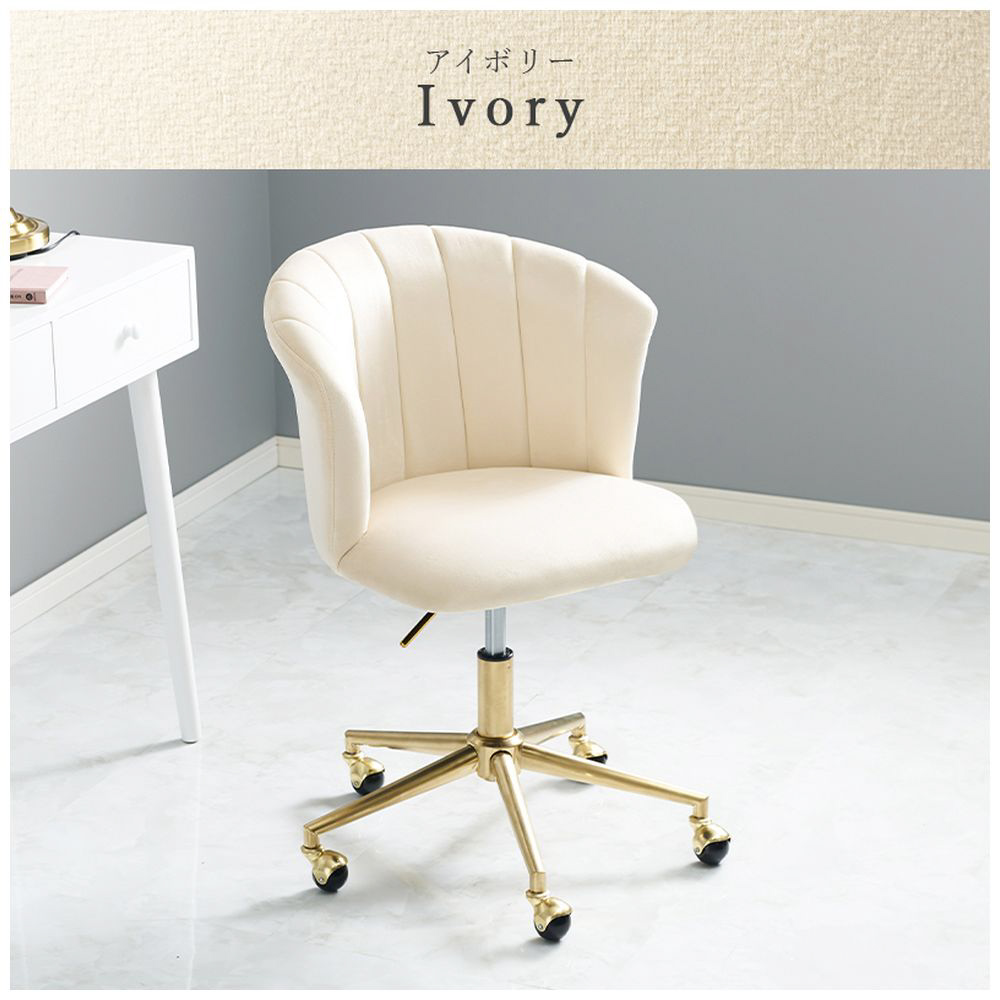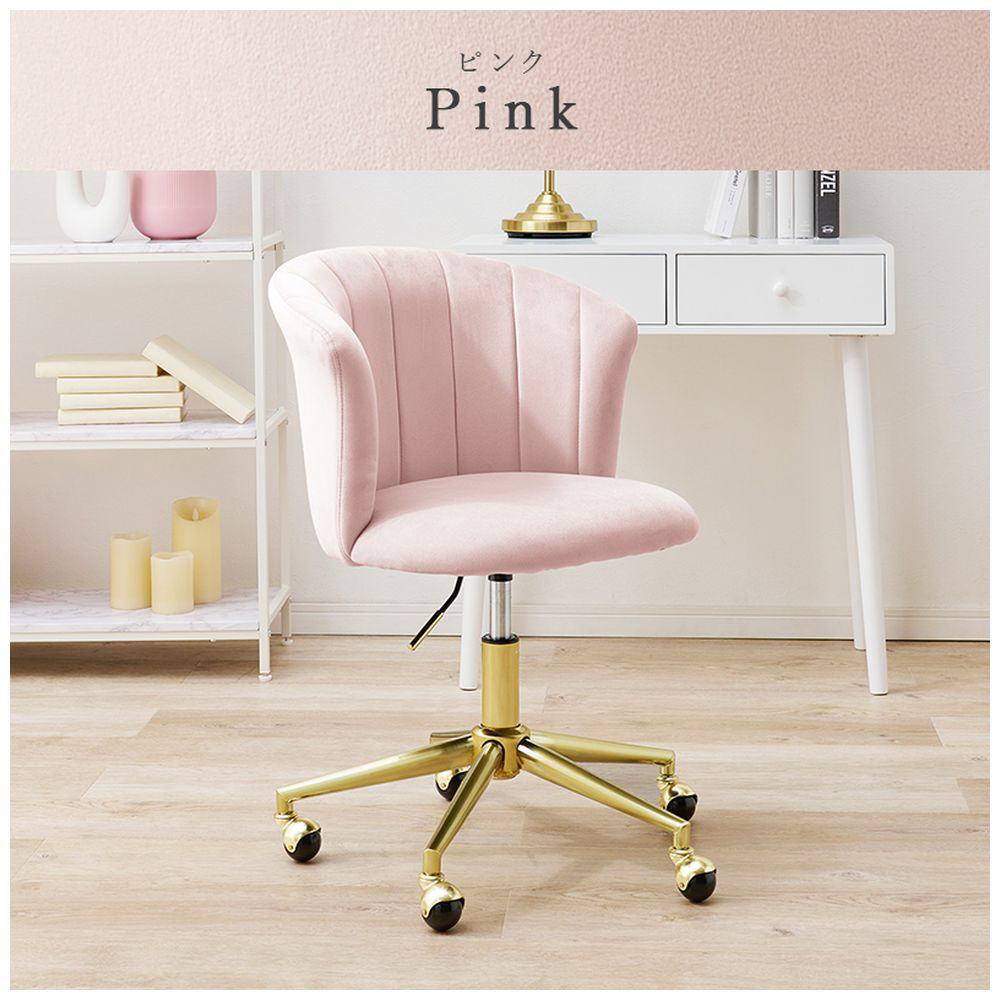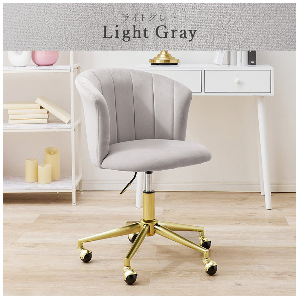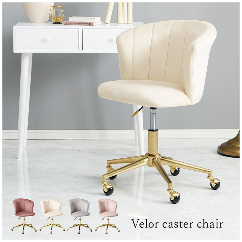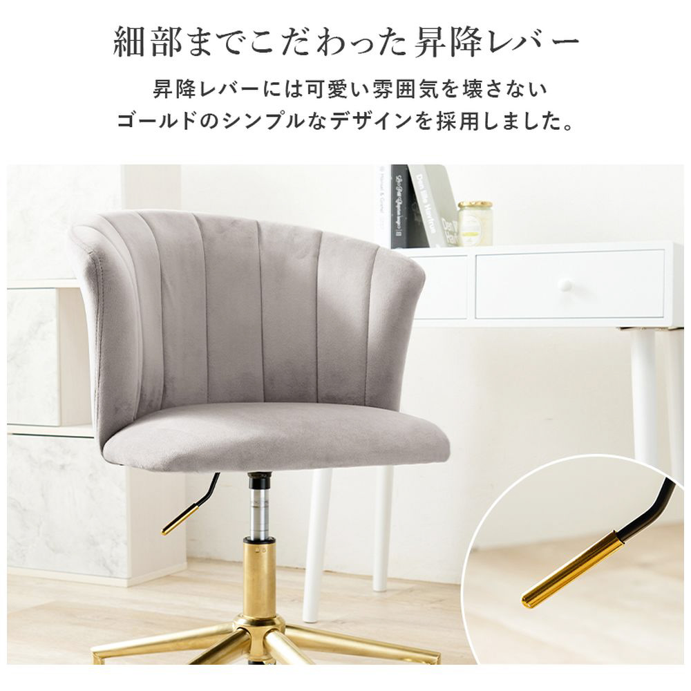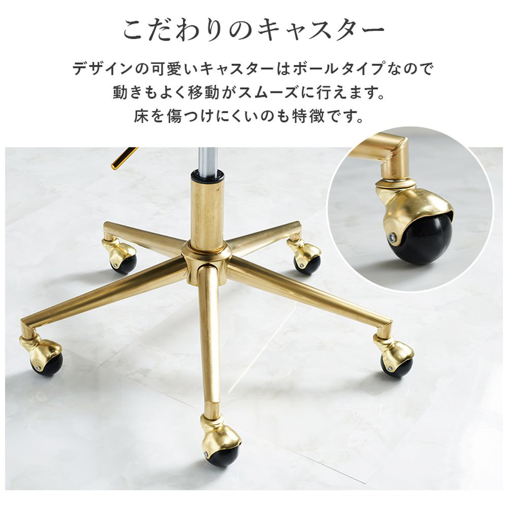 上品さを感じるゴールドの脚にベロア調生地の大人可愛い回転チェアです。キャスター付き