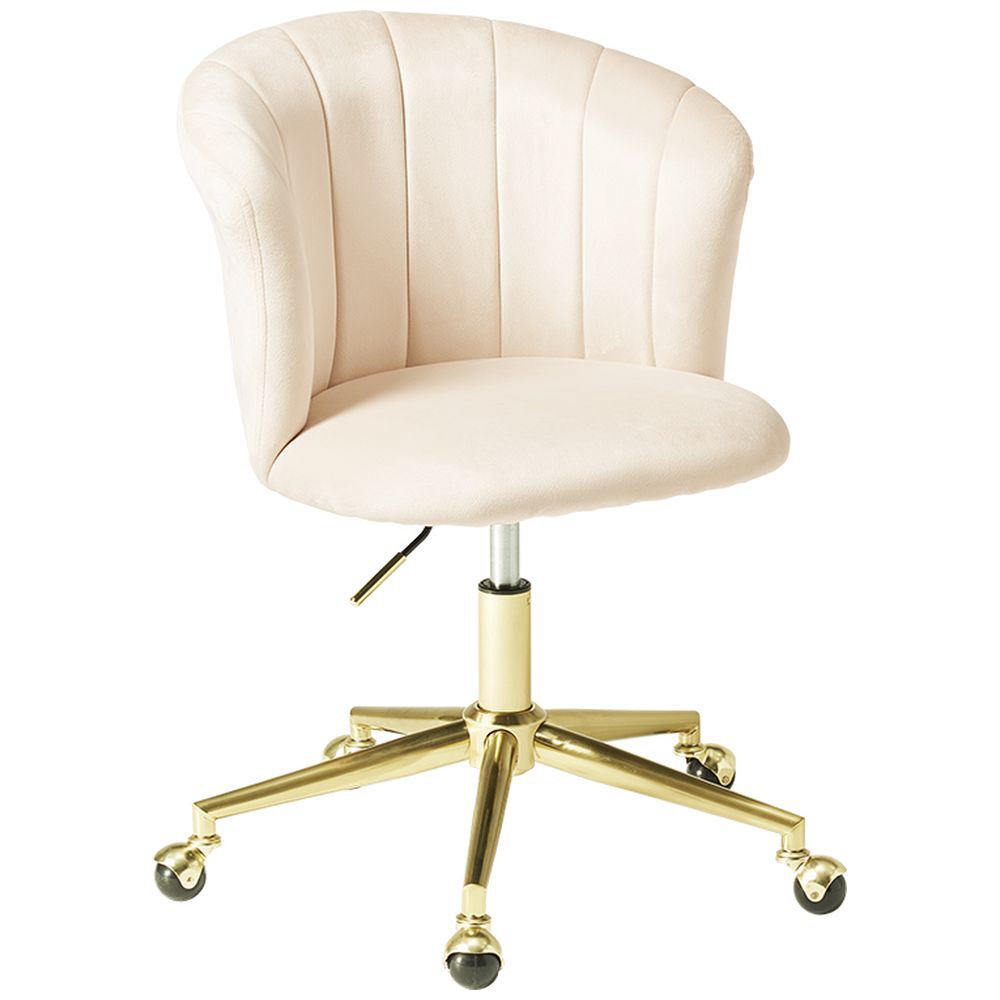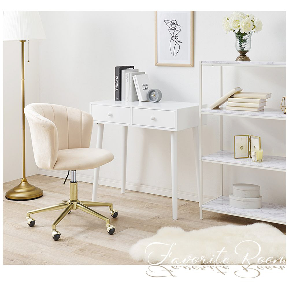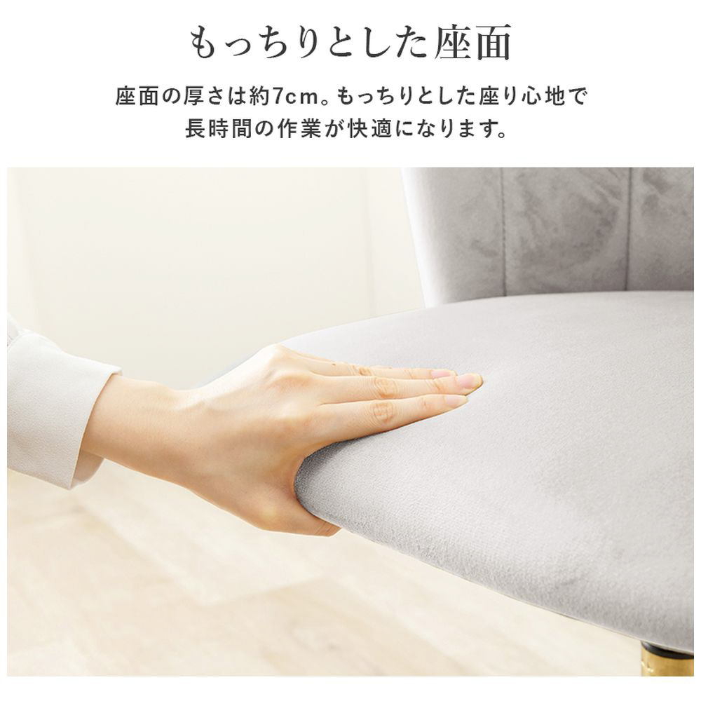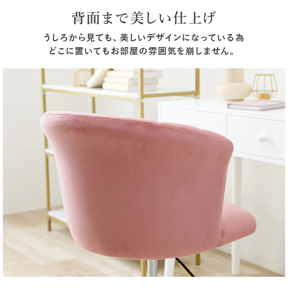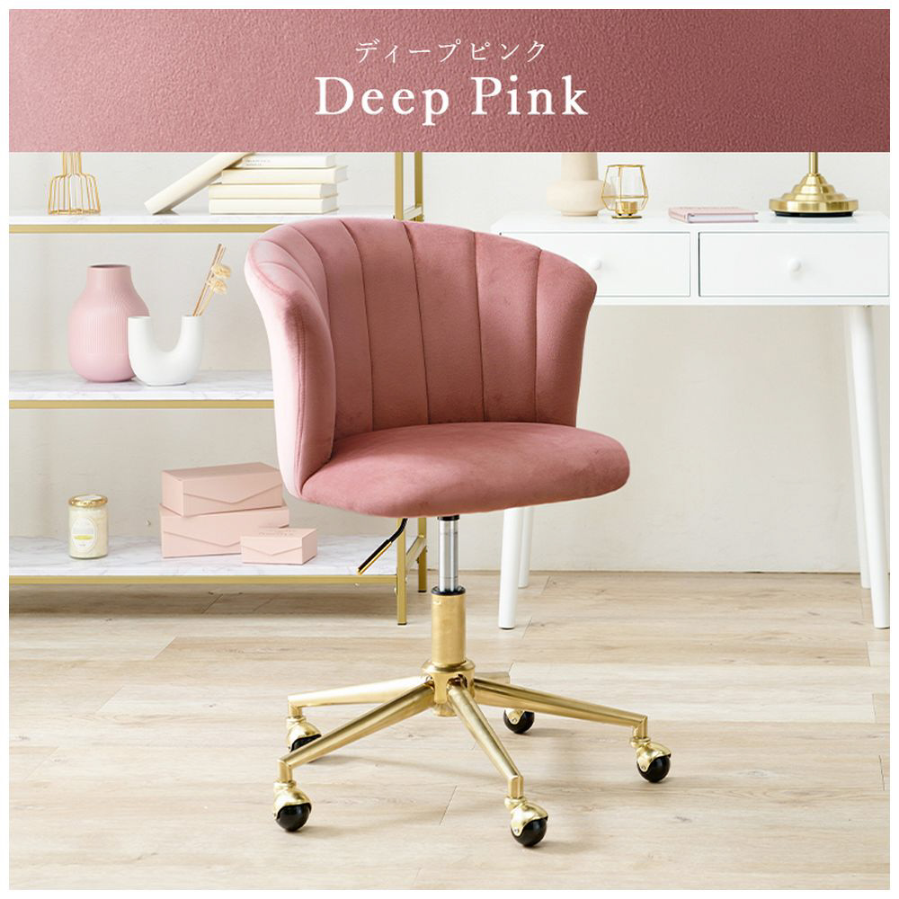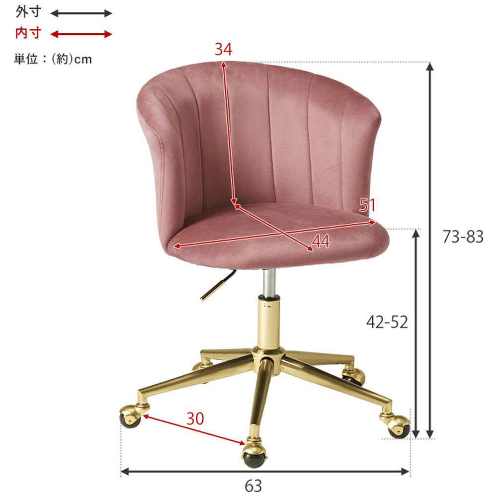 上品さを感じるゴールドの脚にベロア調生地の大人可愛い回転チェアです。キャスター付き