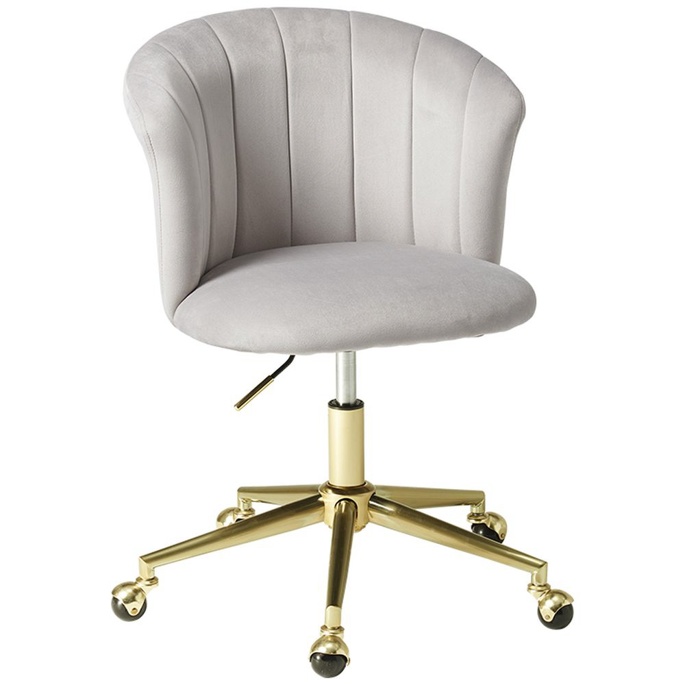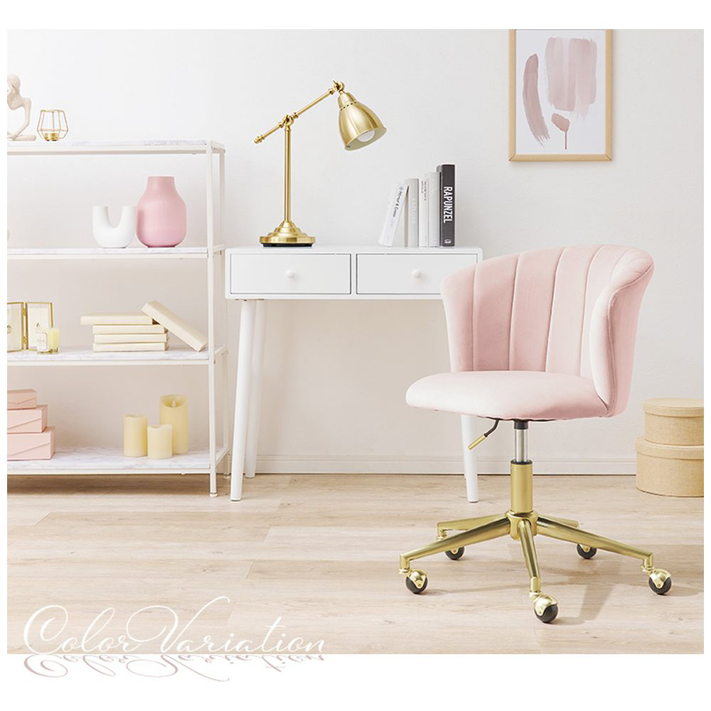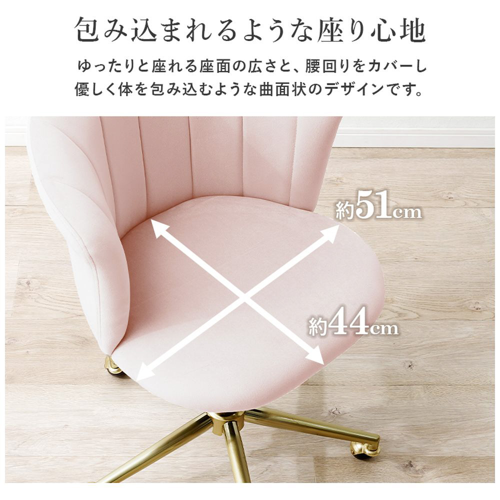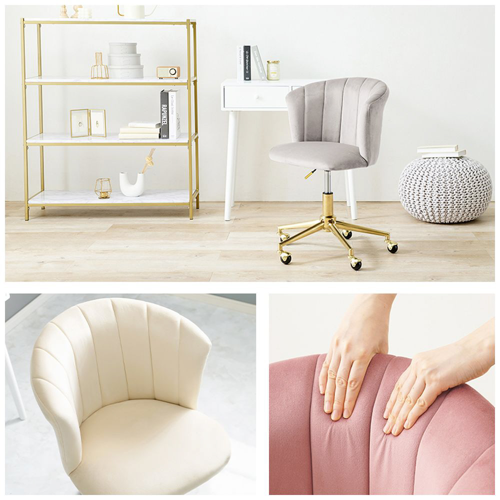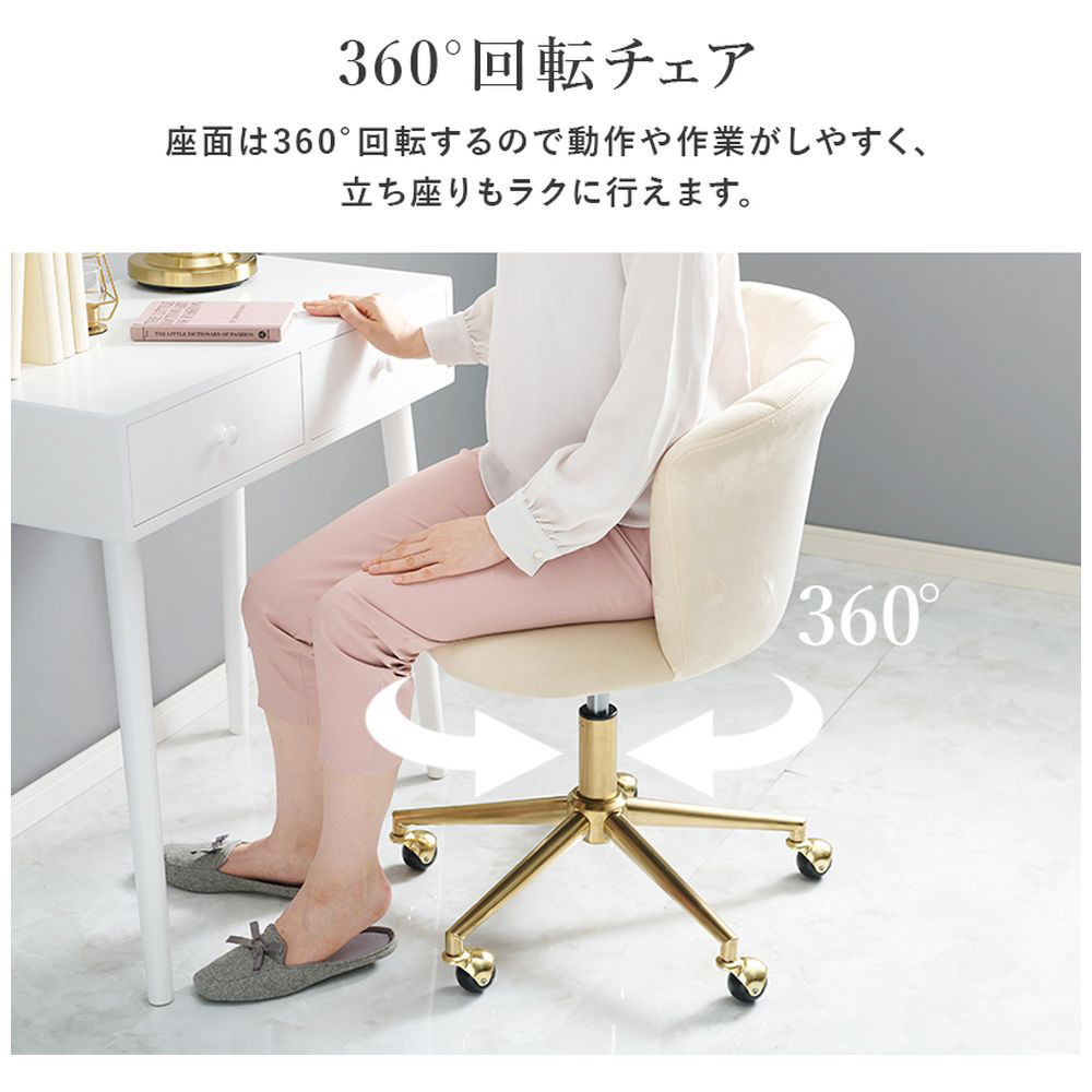 上品さを感じるゴールドの脚にベロア調生地の大人可愛い回転チェアです。キャスター付き