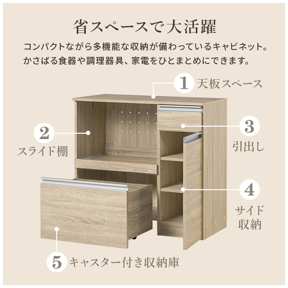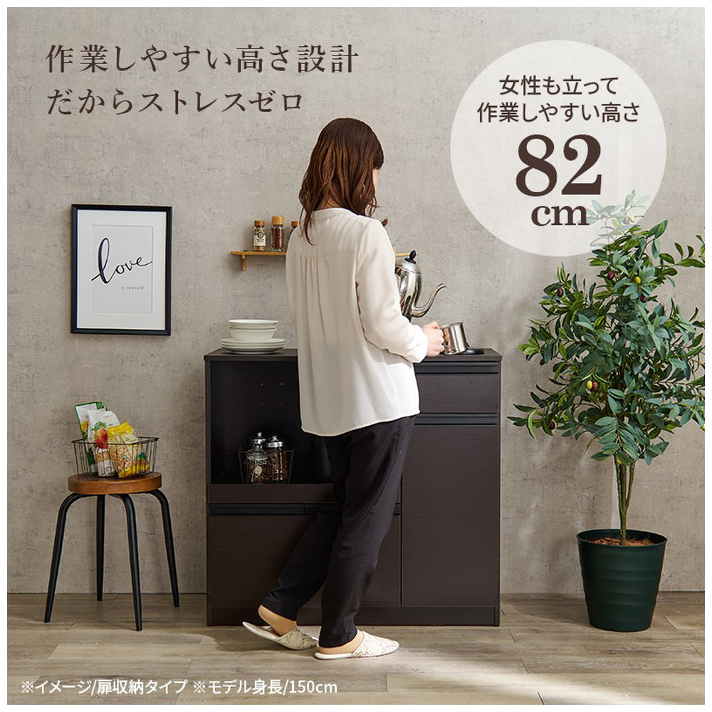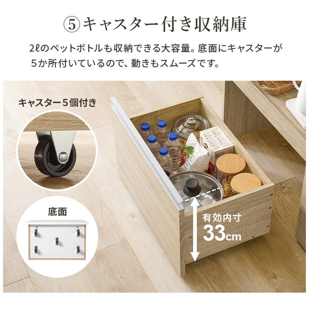 立って作業がしやすい天板高さのカウンターキャビネット。食器や調理器具、キッチン家電がスッキリ片付く大容量収納です。ワゴン収納庫タイプ