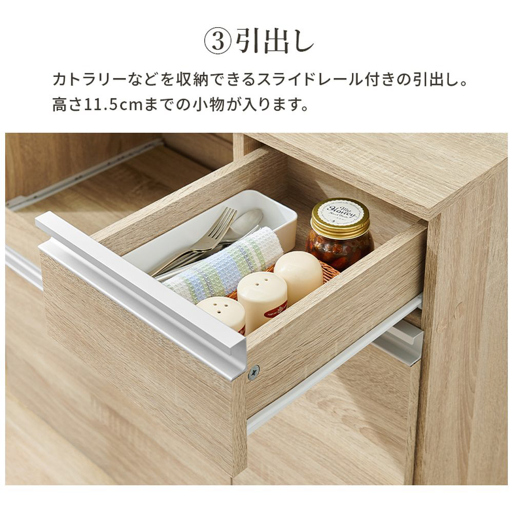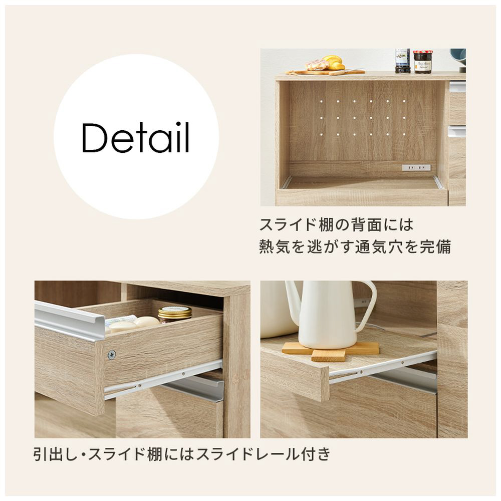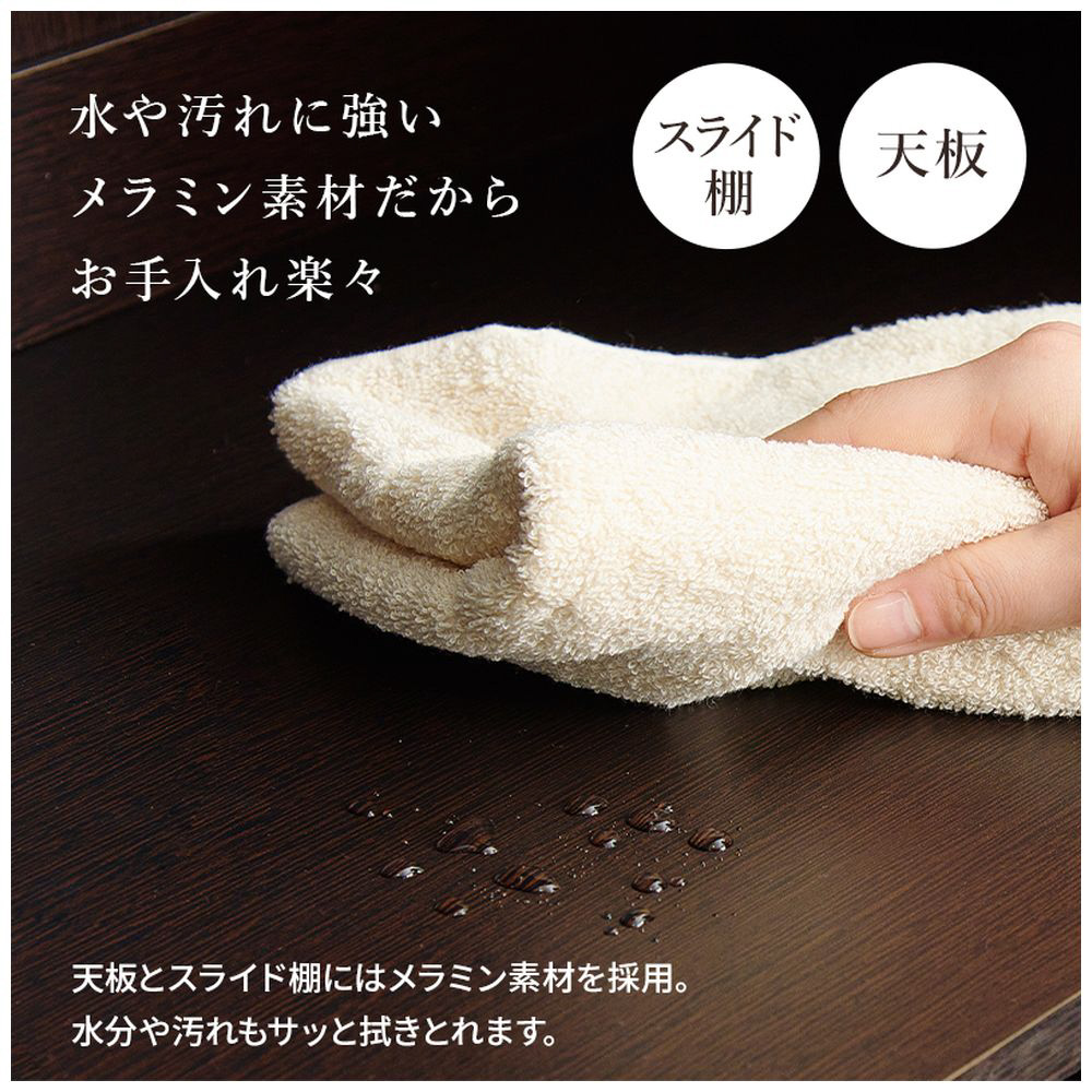 仕様1 ■主材: プリント紙化粧パーティクルボード、天板・スライド棚: 合成樹脂化粧パーティクルボード(メラミン樹脂)、取手: スチール