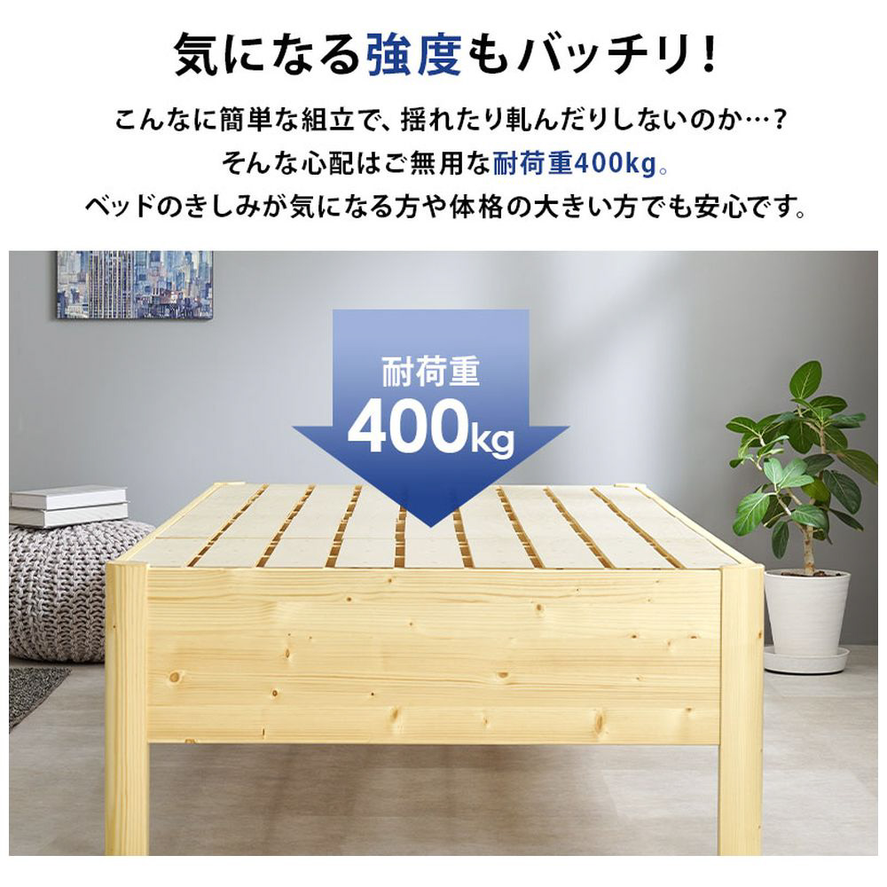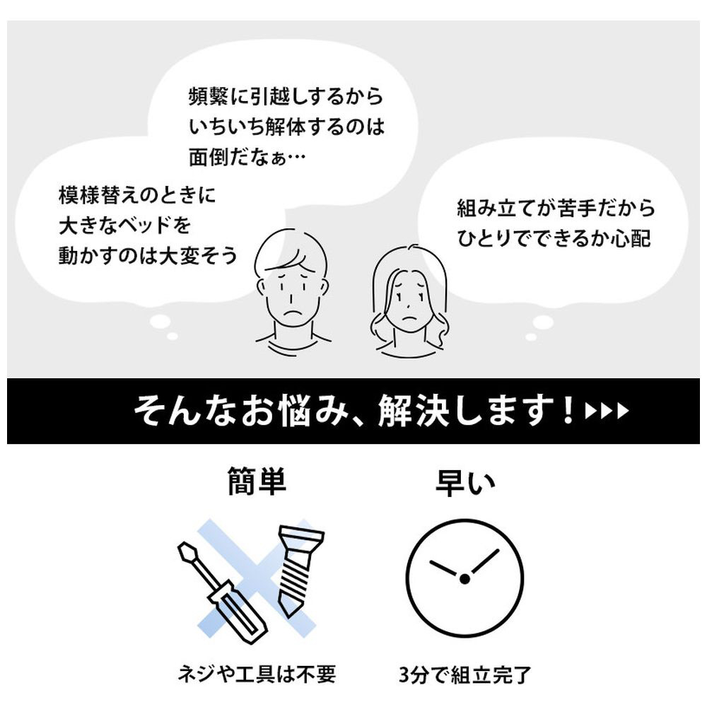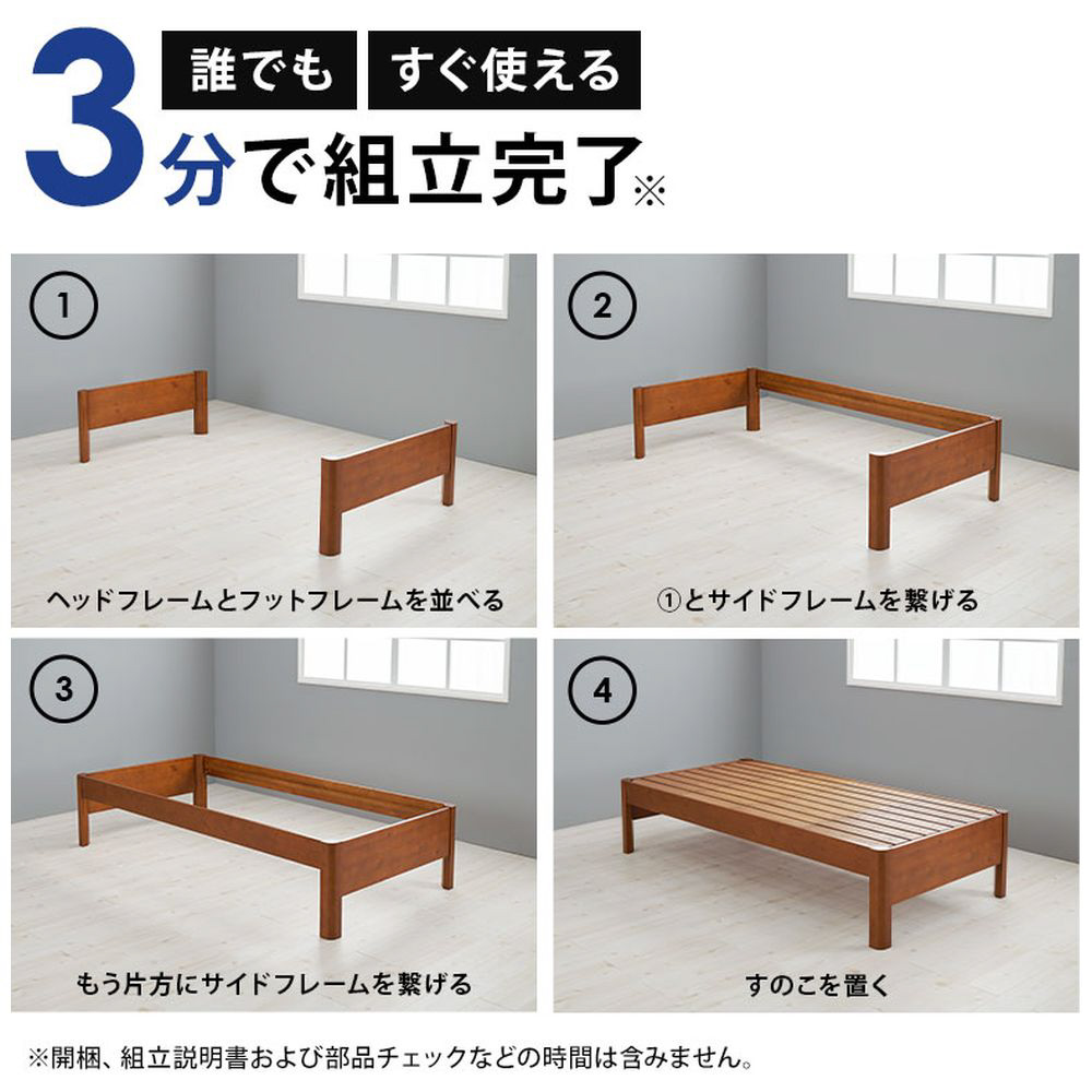 ネジなし、工具不要で簡単組立。床面高さも3段階から選べる、宮棚がなくスッキリシンプルなデザインのシングルベッド。