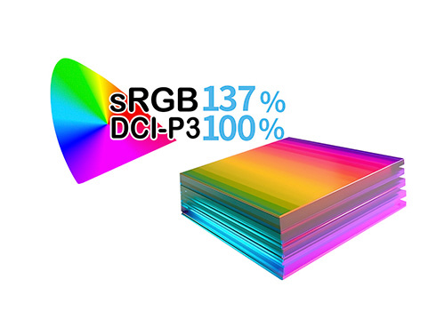 ■あらゆる角度から見ても色やコントラストの変化がおきにくいIPSパネルを搭載し、広視野角上下左右178°を実現します。最大輝度350cd/m2の液晶パネルは、sRGB:137%、DCI-P3:100%の広色域に対応し、動画や写真も色鮮やかに美しく表示します。
