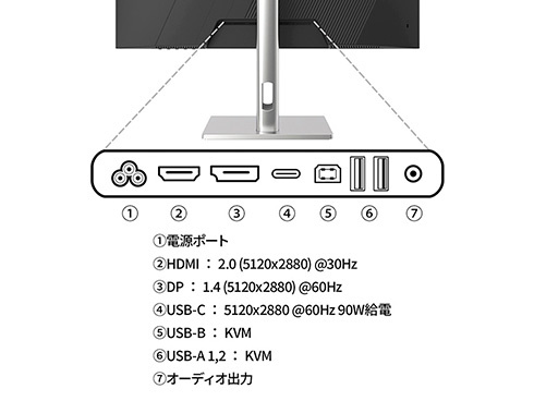■インターフェイスはHDMI2.0 x1 (5K:30Hz、4K:60Hz)、DisplayPort1.4 x1 (60Hz)とUSB Type-C x1 (60Hz/最大90W給電)を装備し、様々な機器との接続が可能です。USB-C(最大90W給電)は、対応のPCであればUSB-Cケーブル1本でモニターへの映像出力とノートPCへの給電が可能。ケーブル1本でスッキリ接続出来るだけでなく、テレワーク、出社併用の場合などノートPCのACアダプターを持ち運ぶ必要が無くなります。