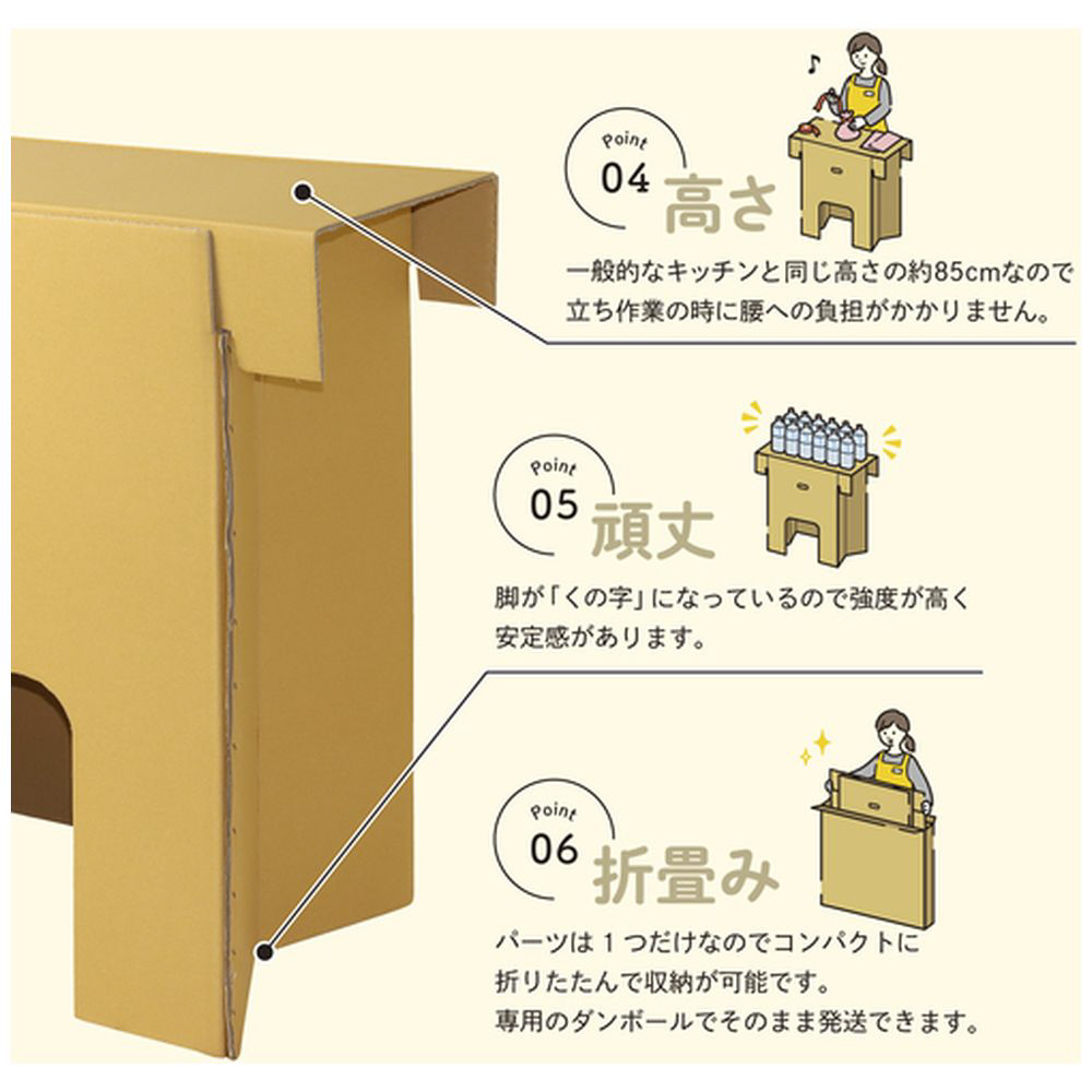 ■重さは約2〜3.7キロ。持ち手があるので一人でも軽々と持ち上げることが出来ます。約85センチの高さなので立ち作業時に腰への負担がかかりません。片面に大きめの窓が付いているので、下の空間を有効に活用できます。用途に応じて向きを使い分けてください。脚が「くの字」になっているので強度が高く、安定感があります。ダンボールは製造時のCO2排出量が少なく、環境に優しい素材です。コンパクトに折り畳み収納可能です。