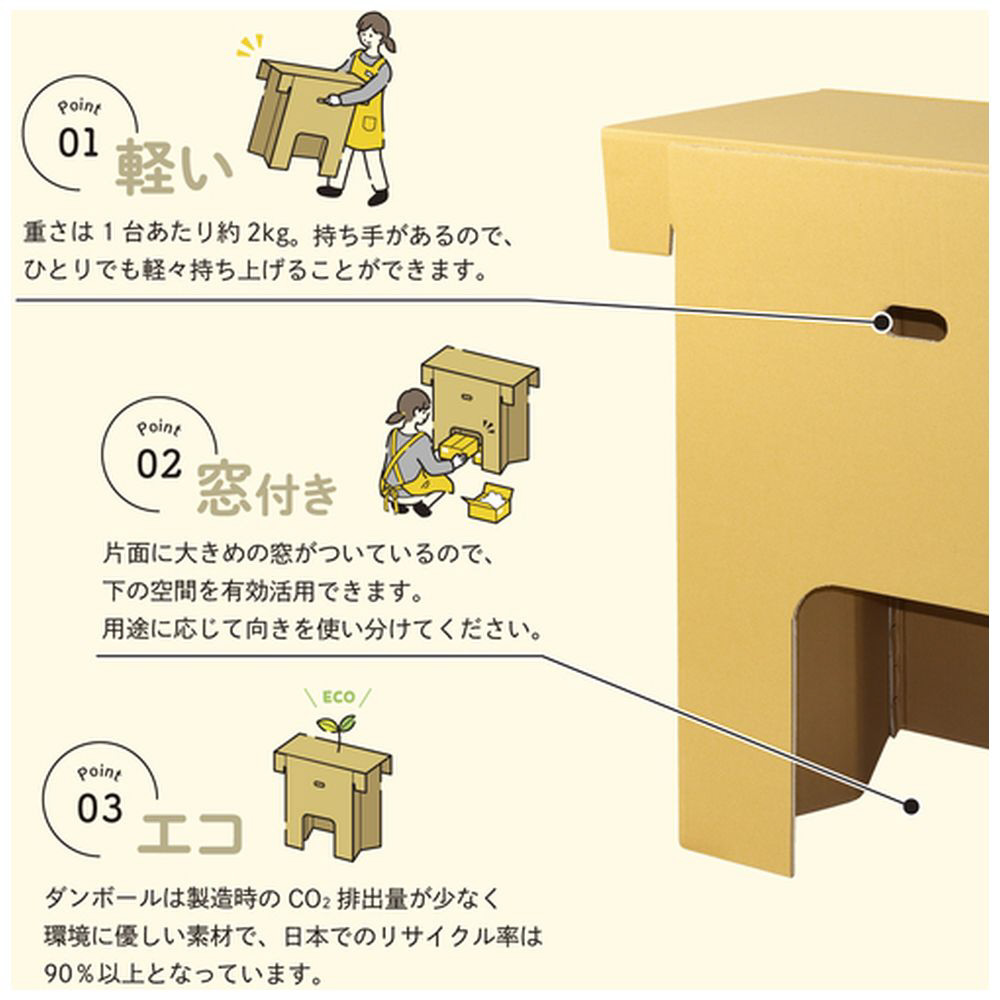 ■重さは約2〜3.7キロ。持ち手があるので一人でも軽々と持ち上げることが出来ます。約85センチの高さなので立ち作業時に腰への負担がかかりません。片面に大きめの窓が付いているので、下の空間を有効に活用できます。用途に応じて向きを使い分けてください。脚が「くの字」になっているので強度が高く、安定感があります。ダンボールは製造時のCO2排出量が少なく、環境に優しい素材です。コンパクトに折り畳み収納可能です。