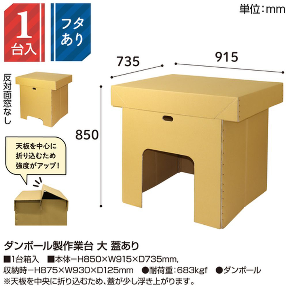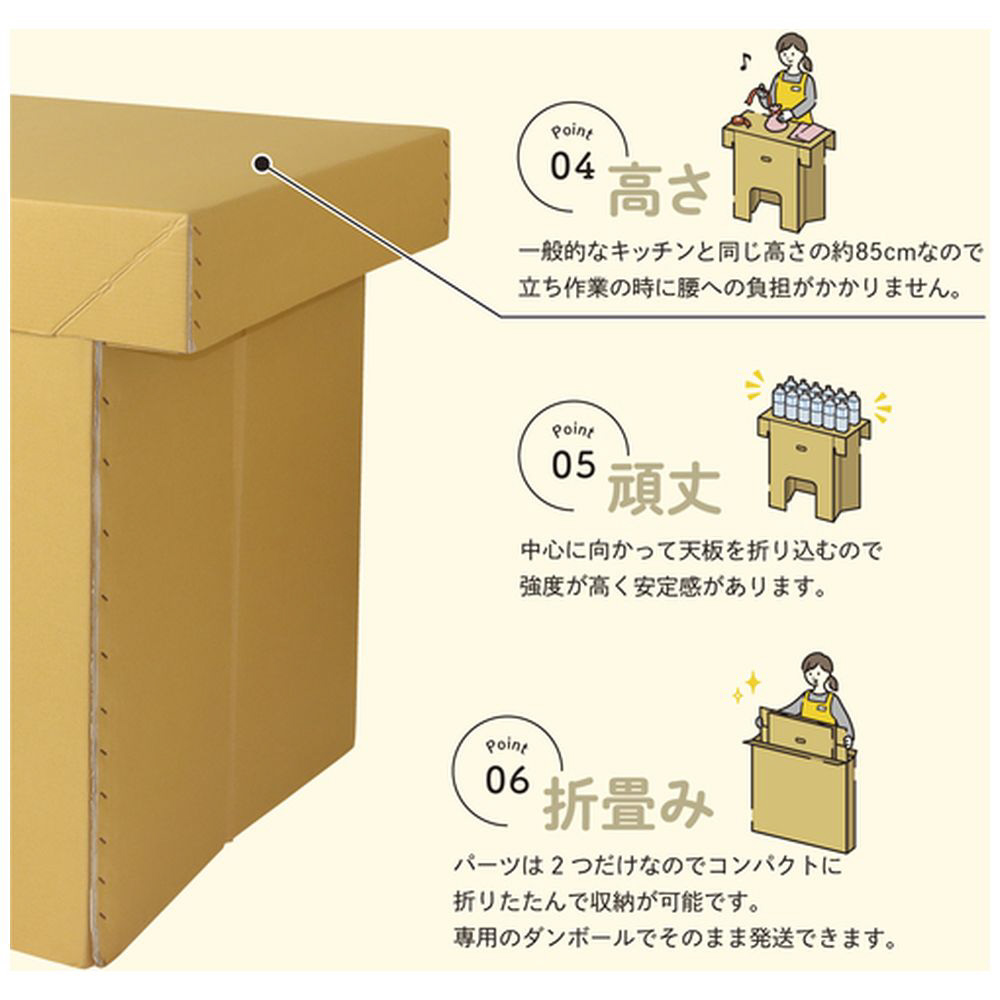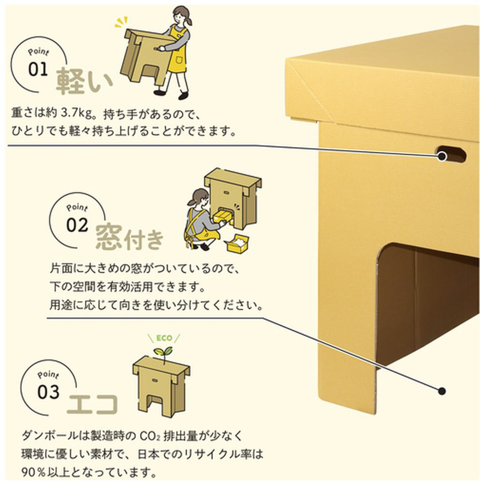 ■重さは約2〜3.7キロ。持ち手があるので一人でも軽々と持ち上げることが出来ます。約85センチの高さなので立ち作業時に腰への負担がかかりません。片面に大きめの窓が付いているので、下の空間を有効に活用できます。用途に応じて向きを使い分けてください。脚が「くの字」になっているので強度が高く、安定感があります。ダンボールは製造時のCO2排出量が少なく、環境に優しい素材です。コンパクトに折り畳み収納可能です。