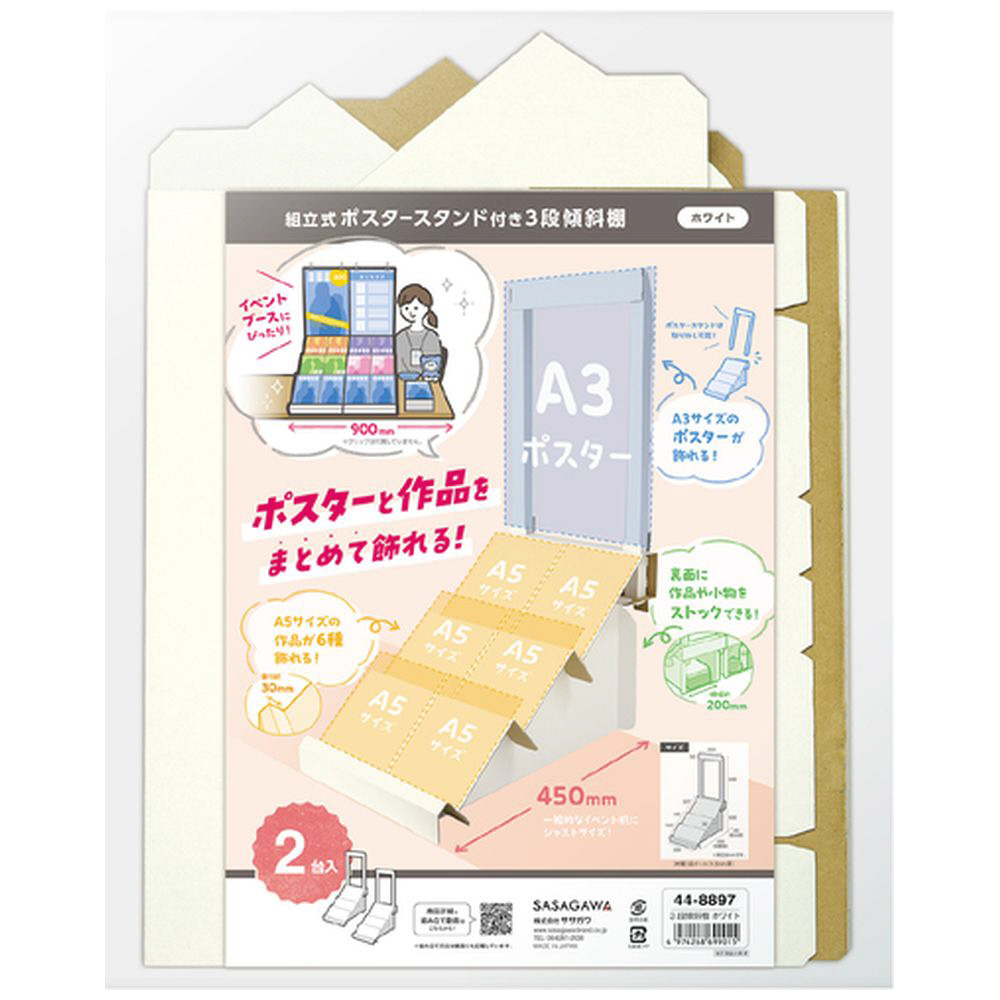 ササガワ 棚 組立式ポスタースタンド付き3段傾斜棚 ホワイト