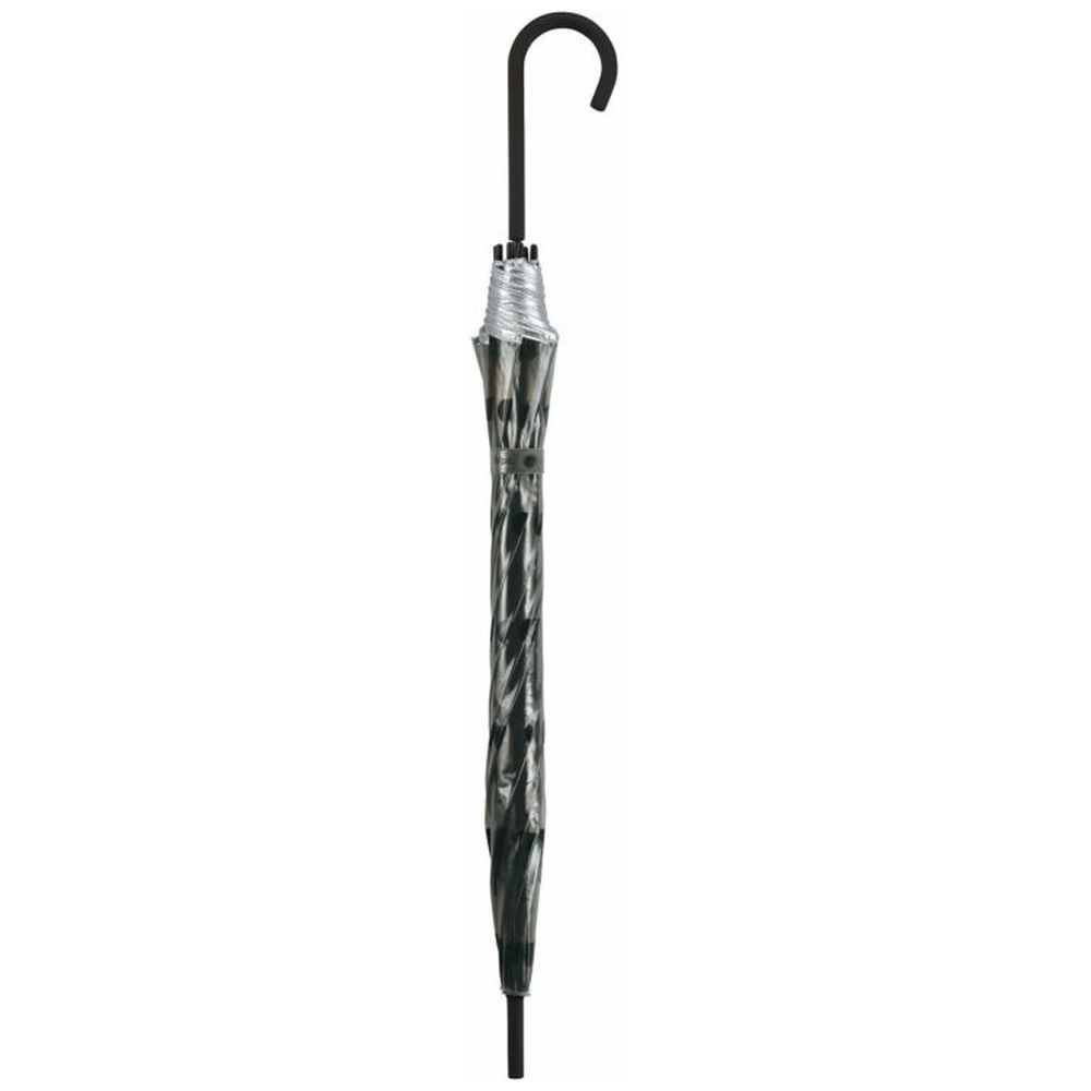 透明な生地にゴールドのパイピングをあしらった「オフ」と、シルバーのパイピングを合わせた「グレー」の2色展開のビニール傘は、全体をモノトーンとドット柄でまとめた大人かっこいいデザインが印象的。
