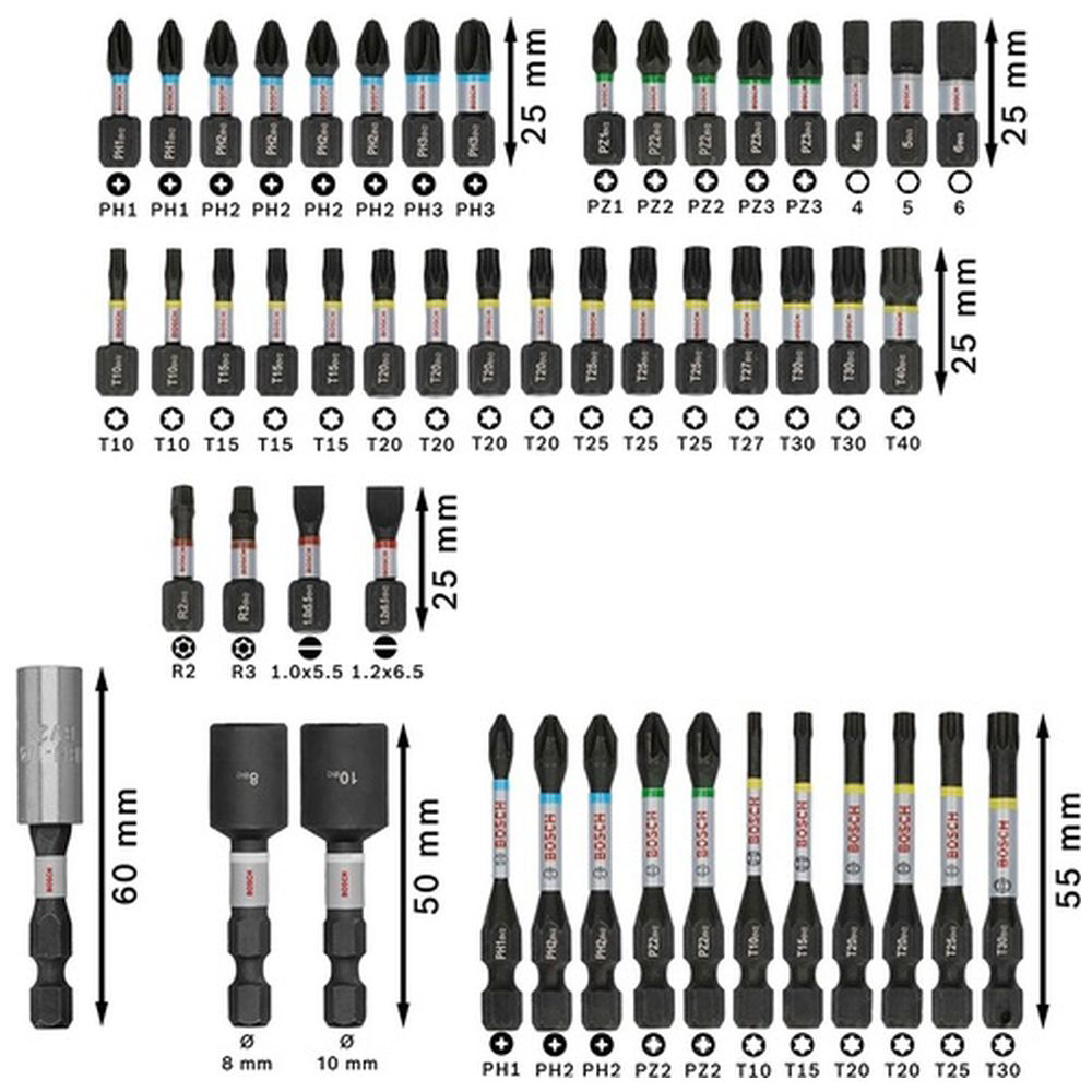 ・25mmドライバービットPH1×2/PH2×4/PH3×2、PZ1/PZ2×2/PZ3×2、T10×2/T15×3/T20×4/T25×3/T27/T30×2/T40、H4/H5/H6、SL5.5/SL6.5、R2/R3