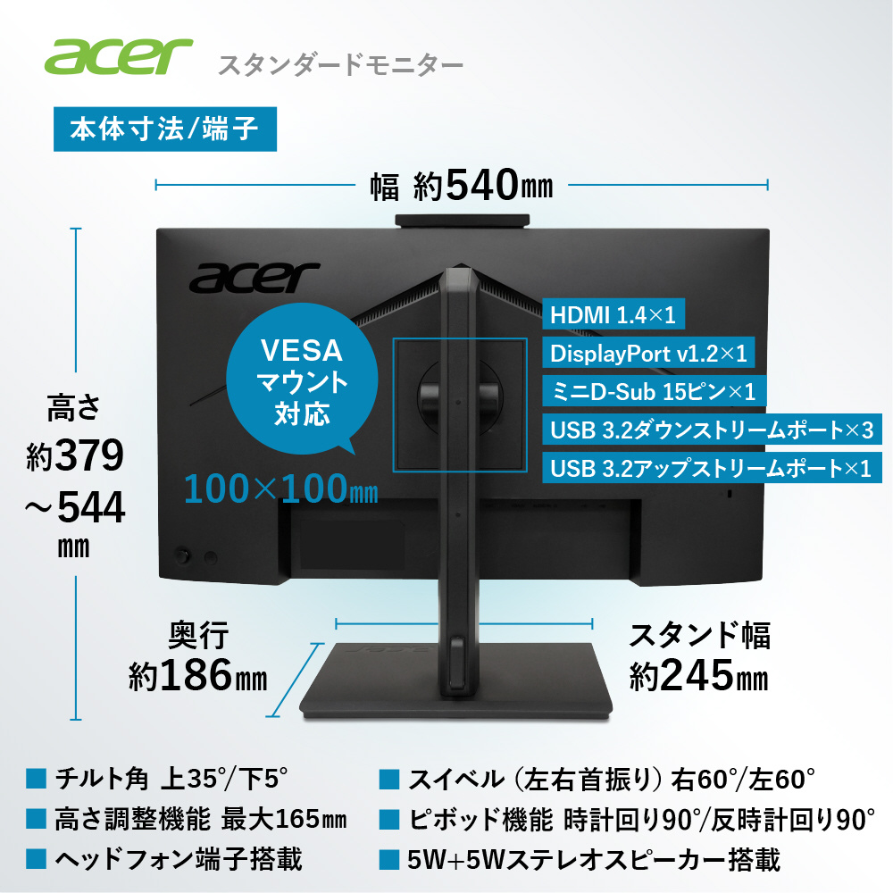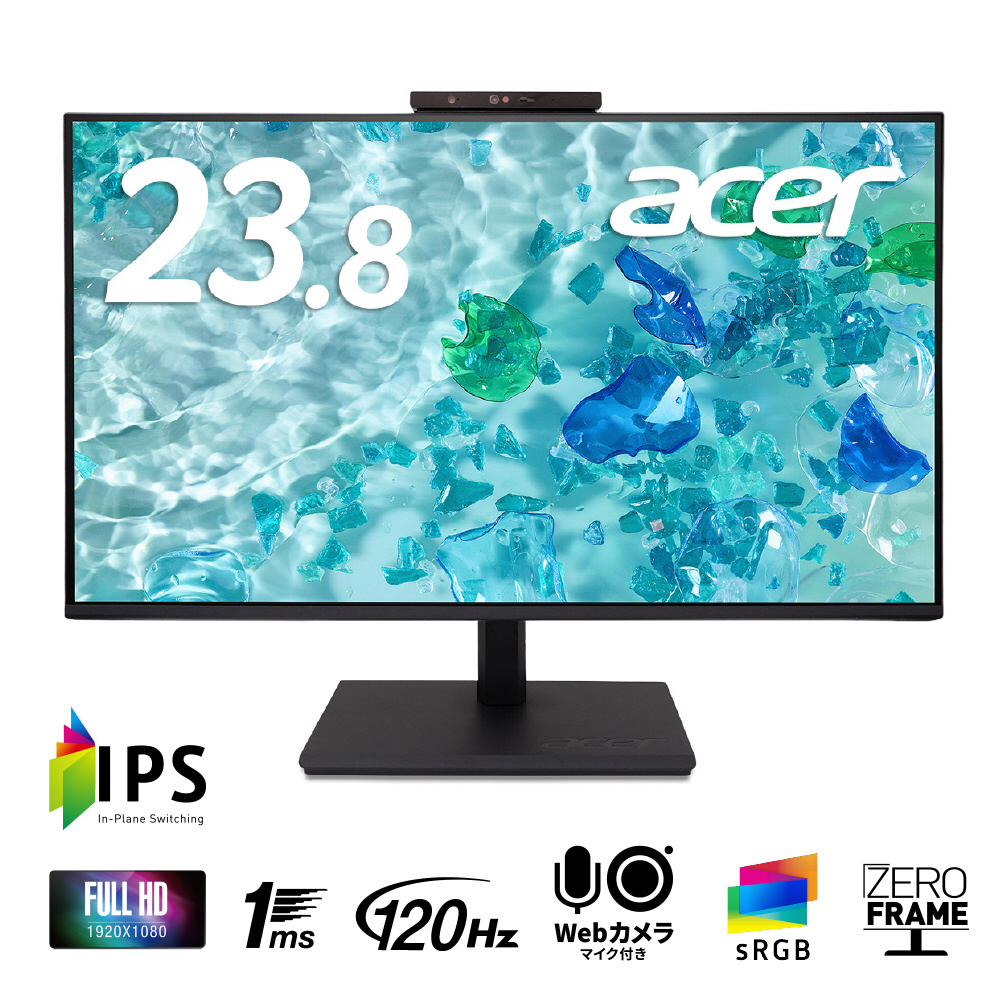 「Acer モニター 23.8インチ FHD IPS 非光沢 120Hz 1ms sRGB 99% HDMI 1.4 DisplayPort 1.2 ミニD-Sub 15ピン USBポート Webカメラ (Windows Hello対応) ヘッドホン端子 スピーカー ゼロフレームデザイン 左右首振り機能 高さ調整機能 VESAマウント対応」