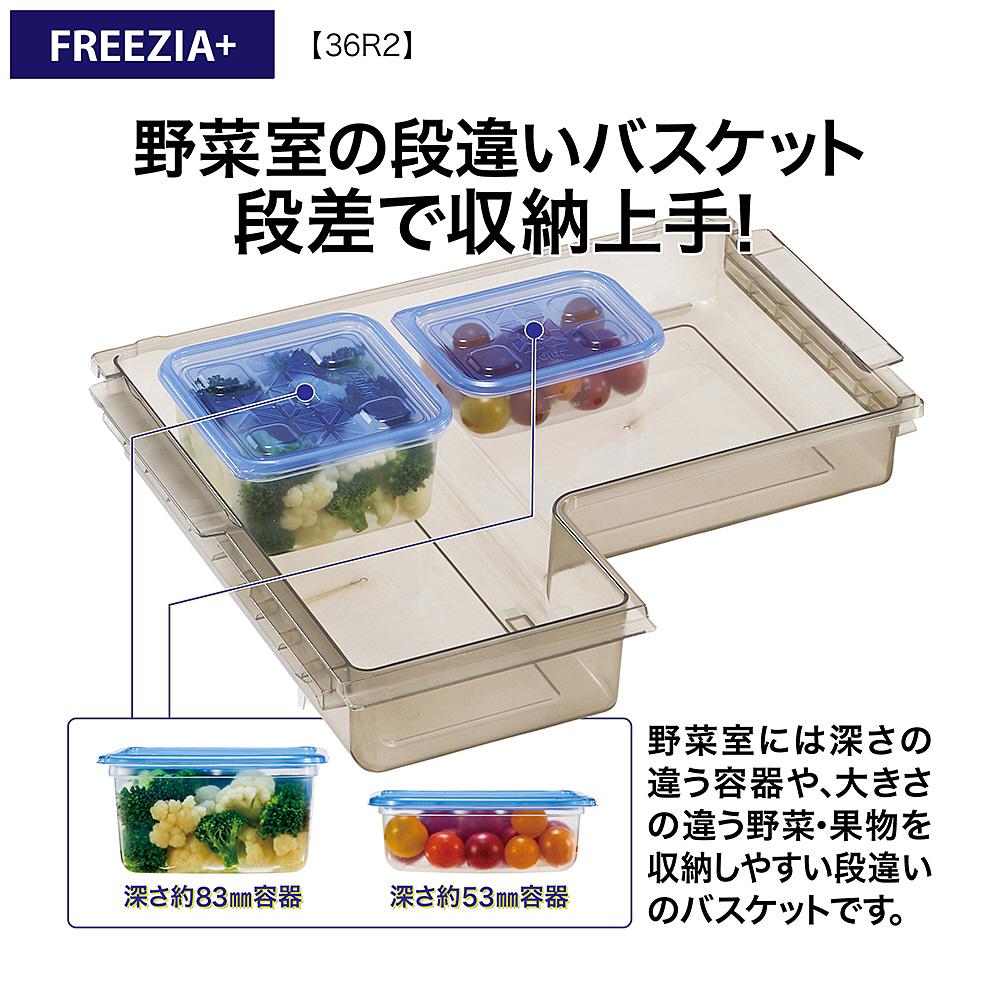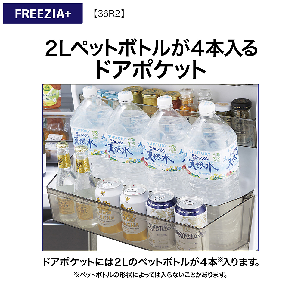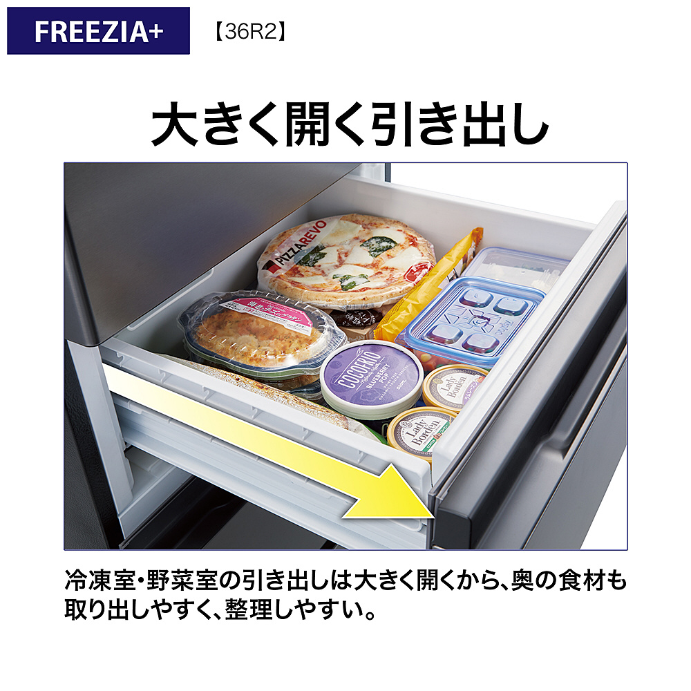 インバーター採用で家計にやさしい省エネ設計。たっぷり入る大容量まんなか2段冷凍室だから、まとめ買いに安心!ラクな姿勢で出し入れしやすい。