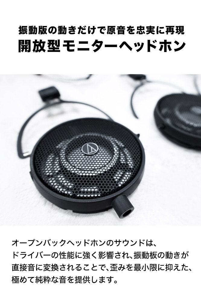 しっかりとした低音域、クリアな中音域、そして滑らかで広がりのある高音域を提供し、細部の表現までモニタリング可能です。オープンバックヘッドホンのサウンドは、ドライバーの性能に強く影響され、振動板の動きが直接音に変換されます。これにより、歪みを最小限に抑えた、極めて純粋なオープンバックサウンドを提供します。