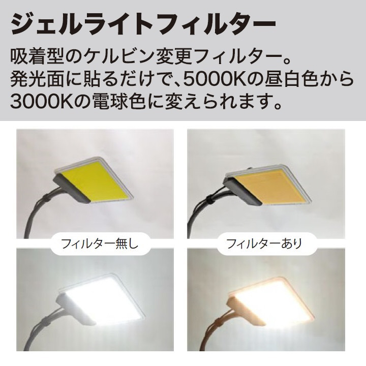 ●付属の吸着型の「ジェルライトフィルター」を発光面に貼るだけで、色温度5000Kの昼白色から3000Kの電球色に変えられます。