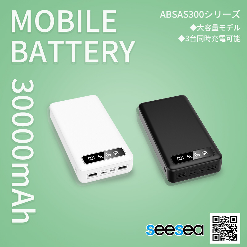 安心の国内サポート2年保証 PSE認証品 高品質 大容量30000mAhモバイルバッテリータイプC入出力搭載 SeeSea モバイルバッテリーAS300BK ABS-AS300-BK
