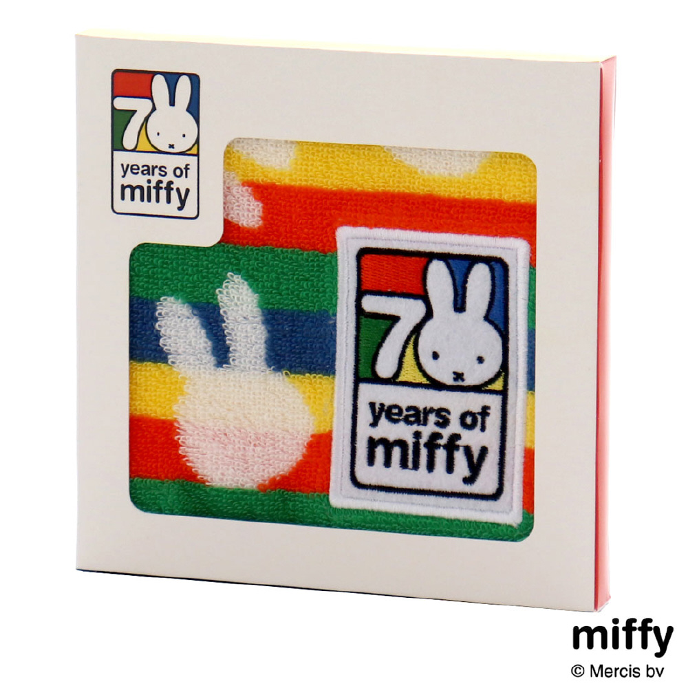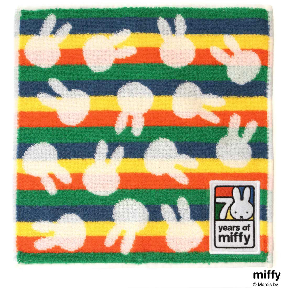 カラフルなボーダーの上にミッフィーのお顔のシルエットが散りばめられたインパクトのあるタオルハンカチ。ミッフィー生誕70周年の記念のロゴが刺繍されています。
