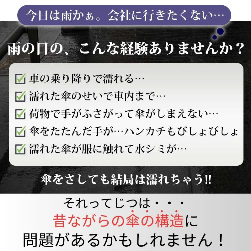どうしても濡れてしまう車の乗り降り。片手でドアを開けて、もう片方の手で傘を閉じる。大雨でも一瞬で車に乗り込むことが可能。