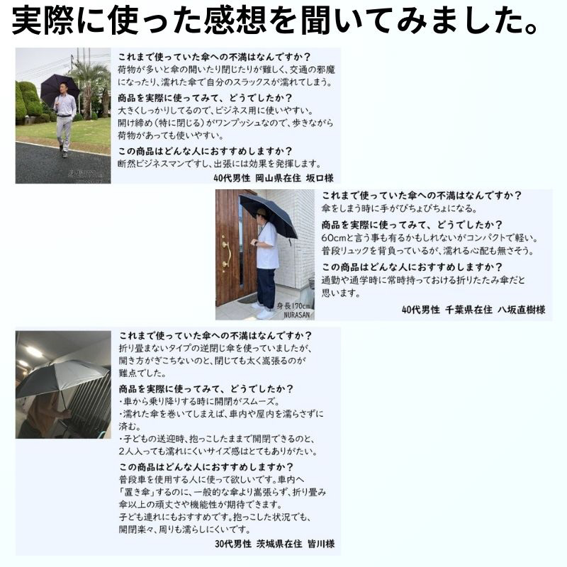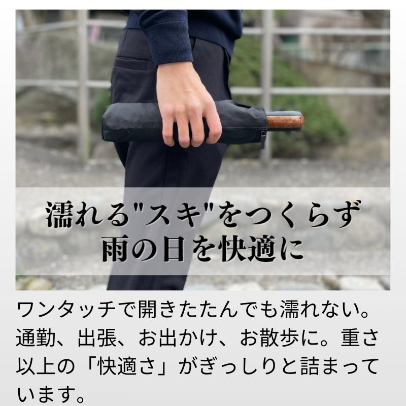 スタンダードな雨専用モデル。濡れるスキをつくらない、通常とは逆の特殊な構造で雨の日のお出かけを快適にする逆折りたたみ傘。車の乗り降りのスキ、傘を開いているスキ、傘を巻き取るスキ、そんなほんのわずかな濡れるスキをなくし、天気に左右されない快適な使いやすさが詰まっています。