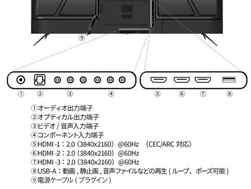 ■インターフェイスはHDMI2.0端子を3つに加え、再生可能なUSBポートを搭載。パソコンや映像機器がなくても、USBに保存した画像や映像を表示することができ、デジタルサイネージとしてもご利用頂けます。※コンテンツの再生にはリモコンでの操作が必要です。自動再生機能には対応しておりません。また、ビデオ/音声入力端子x1、コンポーネント入力端子x1、オプティカル出力端子x1を搭載。様々な機器との接続が可能です。