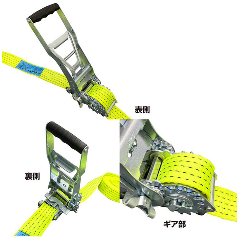 3つのギアホイールによるパワフルな締付けと素早い作業が可能なベルト荷締機です。
